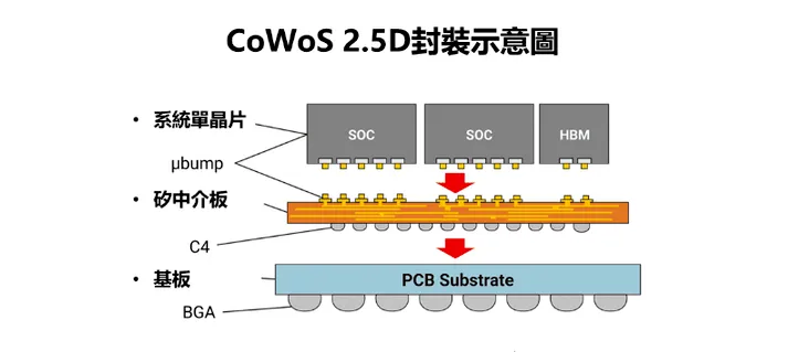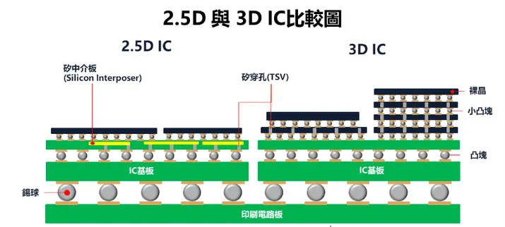 2.5D封装:所谓2.5D封装是指在封装基板与逻辑晶片之间加入一片高密度中介层(通常是矽中介层),将多颗晶片并排封装在该中介层上,再由中介层内部的通矽孔(TSV)实现晶片与基板间的垂直电气连接。这种方案保有平面布局的简单性(因此称为2.5D),又能利用矽中介层上细密布线实现晶片间高速互连。 2.5D封装的代表应用是将高频宽记忆体(HBM)与处理器并置于矽中介层上,例如台积电的CoWoS®(Chip-on-Wafer-on-Substrate)技术,可在单一封装中整合多颗GPU晶粒与多堆HBM记忆体。此类技术已被广泛应用于HPC加速卡与AI训练晶片中,如NVIDIA GPU透过CoWoS整合8颗HBM,使记忆体频宽大幅提升以满足AI模型训练需求。
