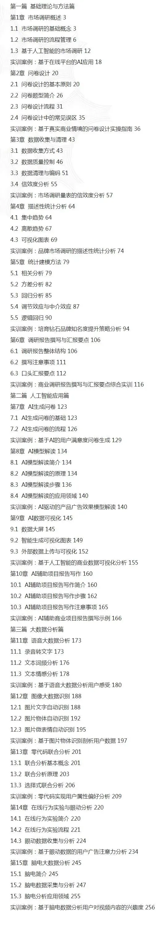 (3)创新调研方法和工具。本书介绍了诸多创新性的调研方法,如AI生成问卷、AI模型解读、AI数据可视化和AI辅助项目报告写作。同时,还涵盖了如语音大数据分析、图像大数据识别、零代码联合分析、在线行为实验与眼动分析、脑电大数据分析等调研工具。这些都为市场调研开拓了新的途径与视角,使调研更加多元化、精准化。