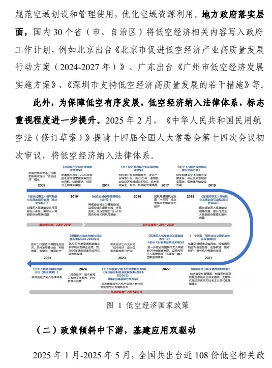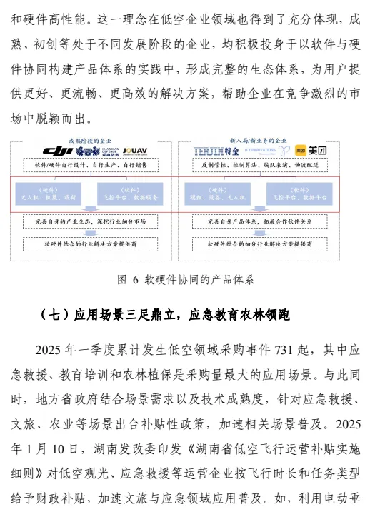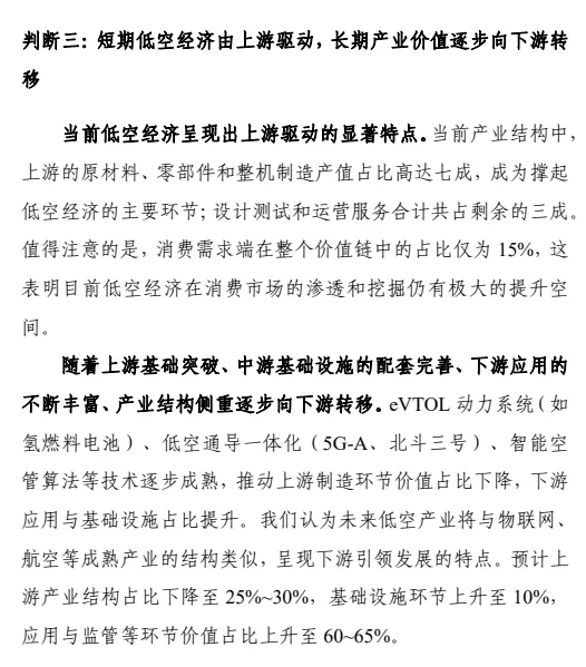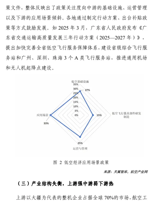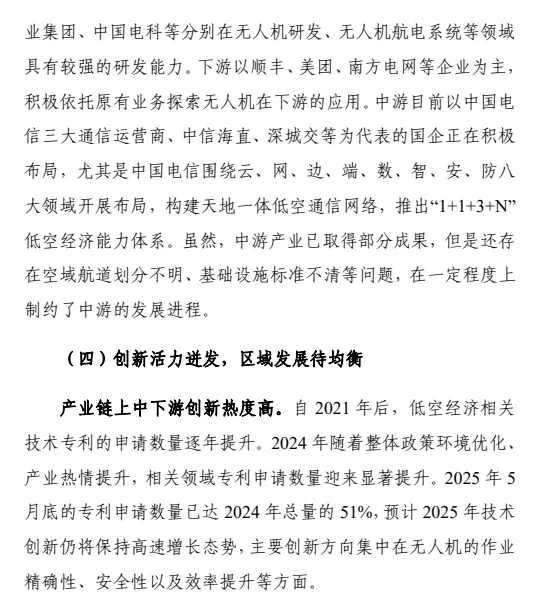 报告指出,低空经济已成为国家战略性新兴产业,正处于政策密集出台、资本加速涌入、技术快速迭代的爆发前夜。当前产业呈现 "上游强、中游弱、下游热" 的结构性特征 —— 以大疆为代表的上游制造企业已占据全球 70% 市场份额,而中游运营服务环节仍待成熟,下游应用场景却在应急、文旅、物流等领域全面开花。这种不均衡发展的现状,恰恰预示着产业即将迎来全面升级的黄金机遇期。