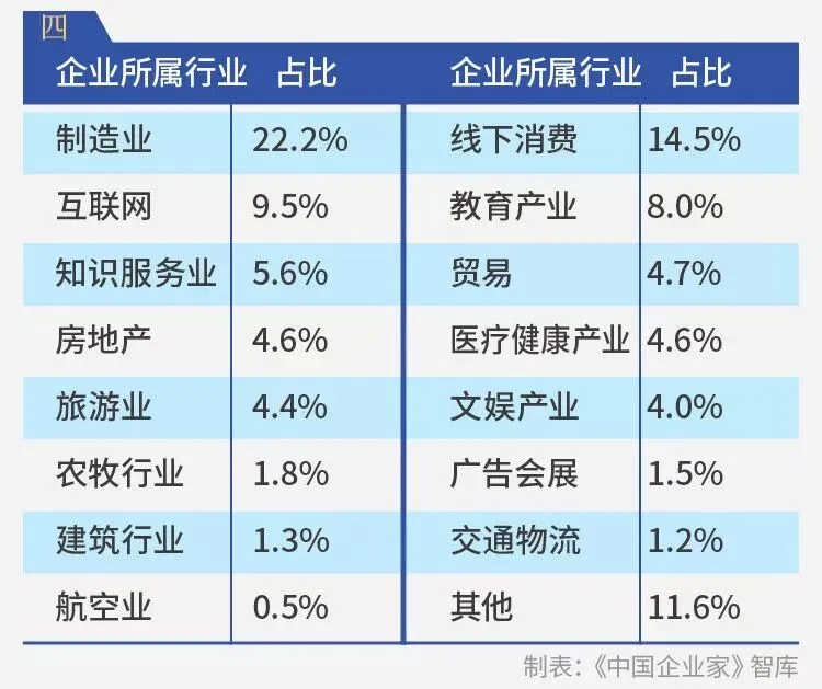 从行业分类来看,制造业企业占22.2%,占比最高;线下消费企业占14.5%,互联网企业占9.5%,教育企业占8.0%;其他主要来自房地产(4.6%)、医疗健康(4.6%)、旅游(4.4%)、农牧行业(1.8%)、广告会展(1.5%)、建筑(1.3%)和交通物流(1.2%)等。总体上来自实体经济的企业占比近8成。