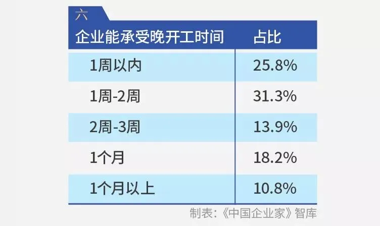 此次疫情对各行业普遍造成影响,受冲击最大的领域集中在制造业和线下消费等实体经济,占比超过8成。调研结果显示,21.7%受访企业认为制造业在此次疫情中损失巨大,占比最高;15.8%的线下消费企业预计自己损失巨大,排第二位。与此同时,57.1%的企业能承受延迟开工的时间在2周以内。