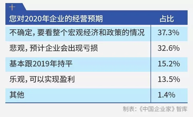 此外,在对2020年的企业经营预期上,有37.3%的企业认为前景不确定,要看宏观大势;32.6%的企业表示悲观,15.2%的企业认为基本跟2019年持平,只有13.5%的企业保持乐观,表示可以实现盈利,剩余1.4%企业选择了其他,包括倒闭、利润大幅下降等。