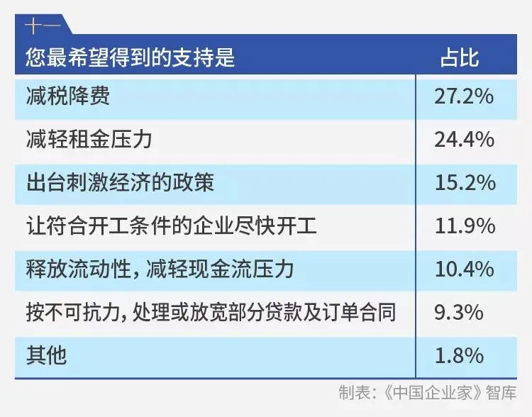 “二八现象”之九:8成企业希望能够“减税减租增资增贷”,这说明企业既需要宏观政策刺激经济恢复信心,更需要真金白银支持来直接降低成本。连日来,国务院各部委及地方政府出台了许多支持企业发展政策措施,访谈中,企业家们更希望支持政策要实要细,比如,免收或缓交停工期社保、减免租金、提供抗疫专项贷款等方面。