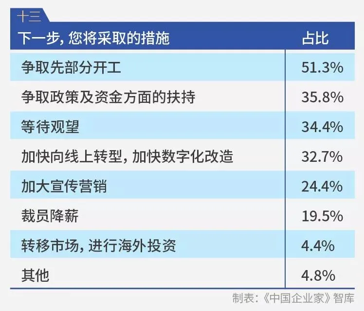 从调研数据看,八成企业已经积极展开自救,一半以上企业下一步将第一时间争取恢复生产,三成以上企业将加快向线上转型、加快数字化改造。