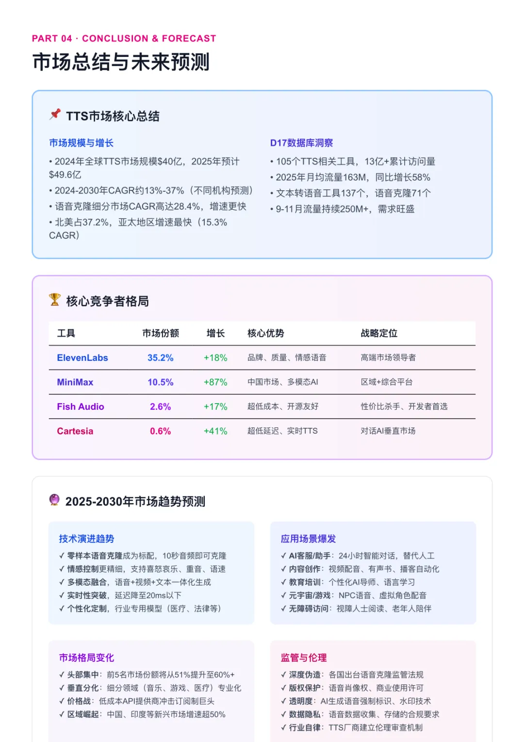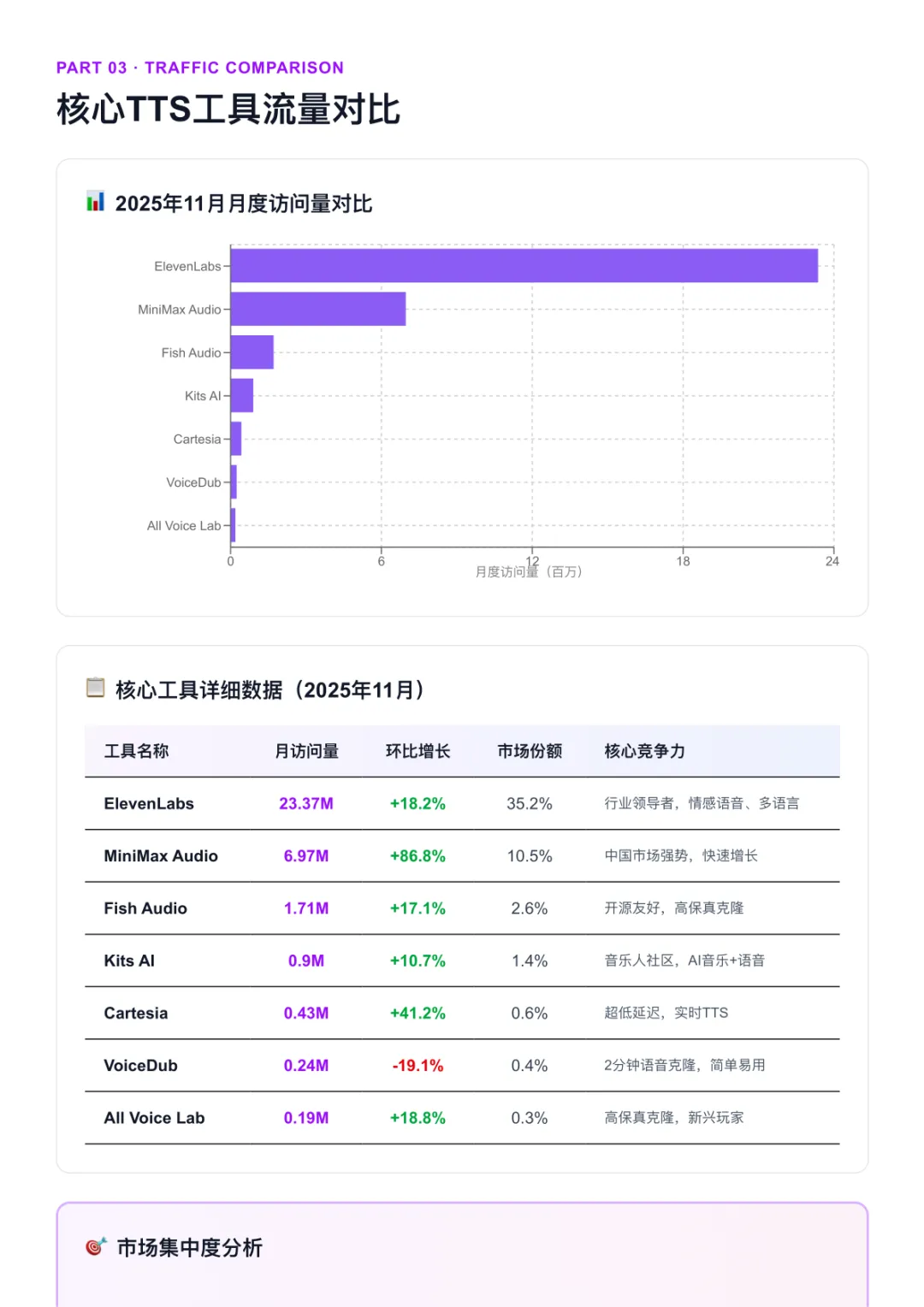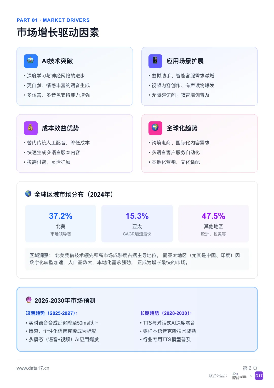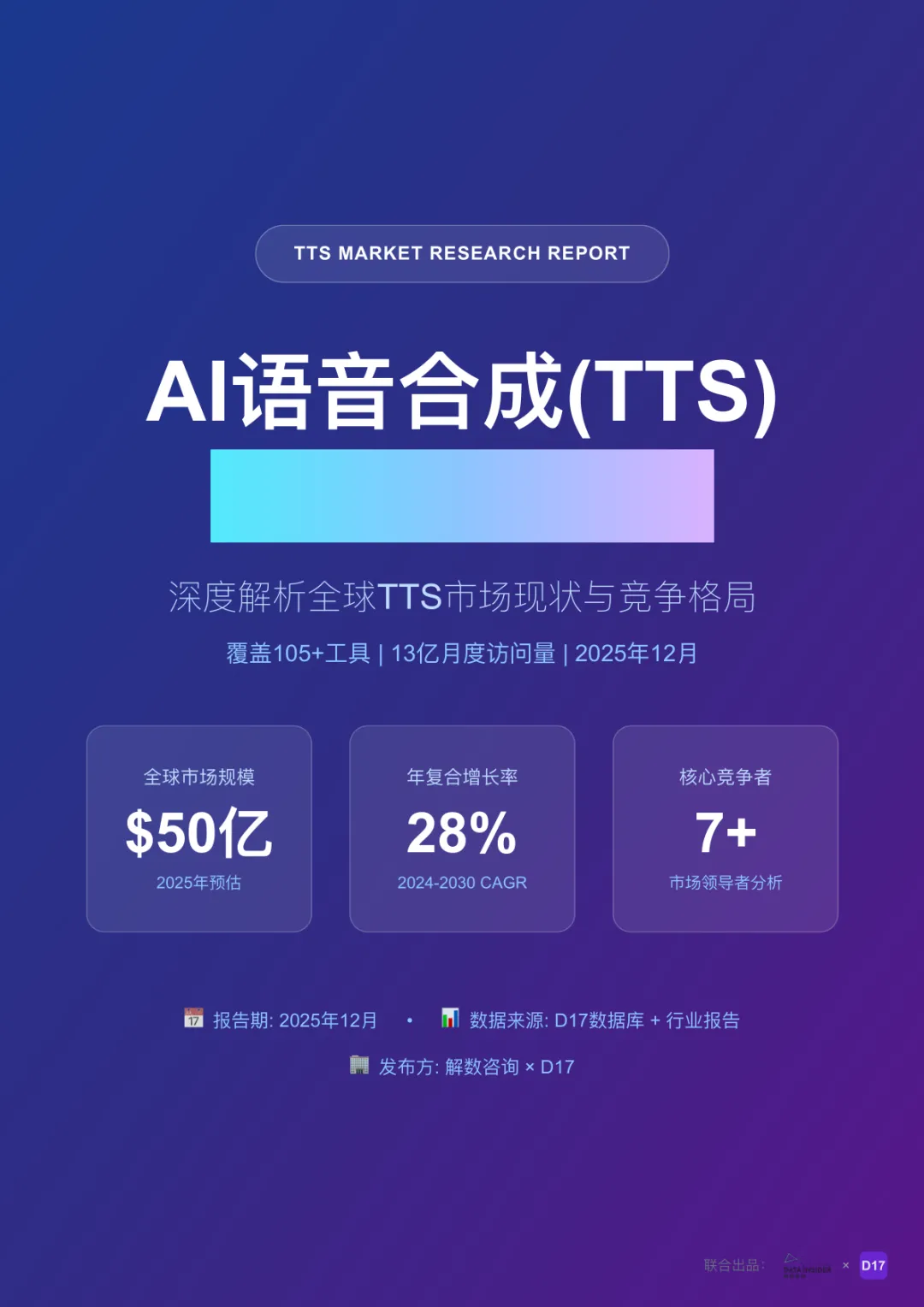 导读:报告聚焦全球 AI 语音合成市场现状、竞争格局与未来趋势,基于 105 款工具、13 亿月度访问量数据,提供全面行业洞察。2024 年全球 TTS 市场规模达 40 亿美元,2025 年预估增长 24% 至 49.6 亿美元。语音克隆作为高端细分领域表现突出,2024 年规模 24 亿美元,预计 2030 年将达 96 亿美元,年复合增长率 28.4%。北美市场占比 37.2% 主导行业,亚太地区凭借数字化转型需求成为增速最快区域。市场呈现 “一超多强” 格局,ElevenLabs 以 35.2% 市场份额领跑,MiniMax Audio 凭借中国市场优势与多模态功能快速崛起。工具功能集中于文本转语音与语音克隆,多模态融合、低延迟、情感化成为技术创新方向。应用场景覆盖内容创作、智能客服、教育培训等,未来零样本语音克隆与行业专用模型将加速普及。
