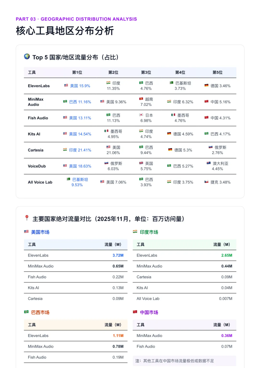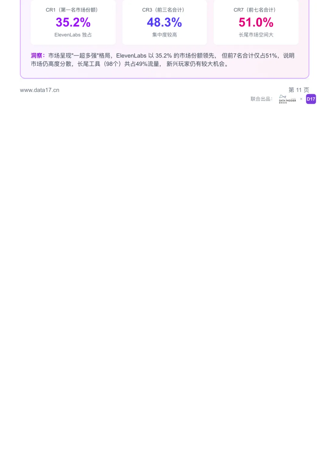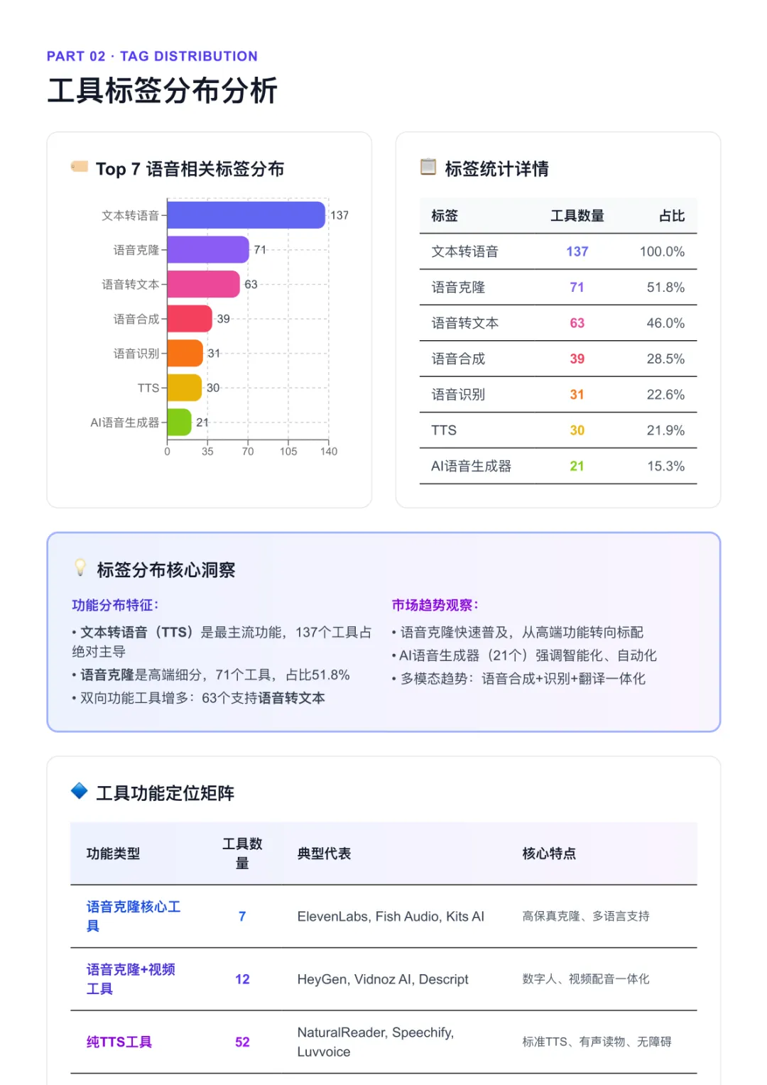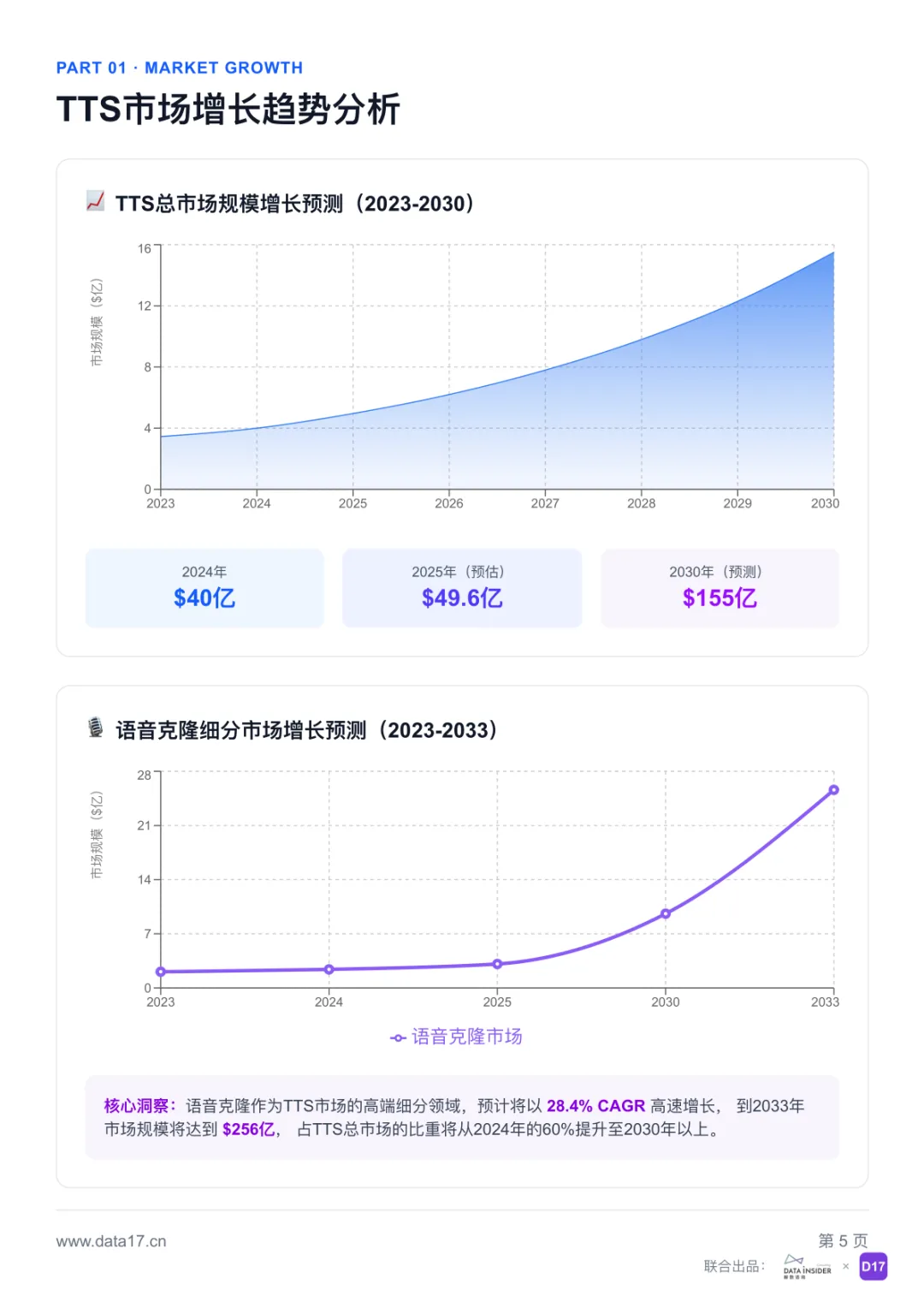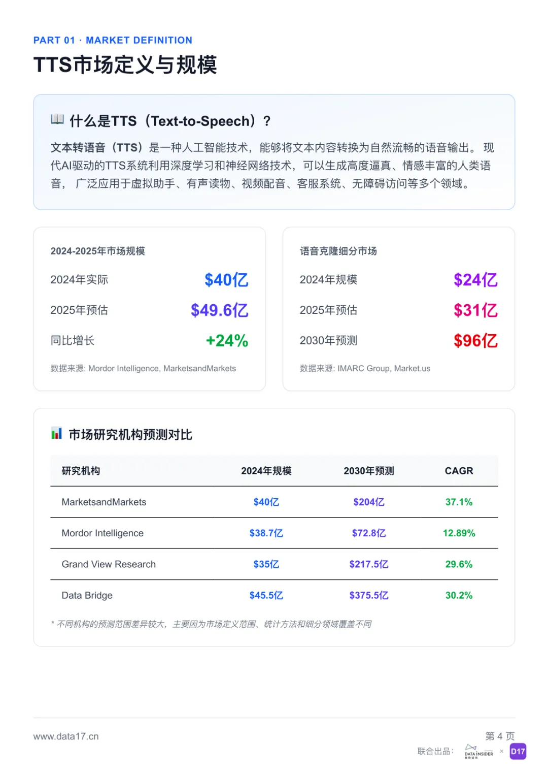 导读:报告聚焦全球 AI 语音合成市场现状、竞争格局与未来趋势,基于 105 款工具、13 亿月度访问量数据,提供全面行业洞察。2024 年全球 TTS 市场规模达 40 亿美元,2025 年预估增长 24% 至 49.6 亿美元。语音克隆作为高端细分领域表现突出,2024 年规模 24 亿美元,预计 2030 年将达 96 亿美元,年复合增长率 28.4%。北美市场占比 37.2% 主导行业,亚太地区凭借数字化转型需求成为增速最快区域。市场呈现 “一超多强” 格局,ElevenLabs 以 35.2% 市场份额领跑,MiniMax Audio 凭借中国市场优势与多模态功能快速崛起。工具功能集中于文本转语音与语音克隆,多模态融合、低延迟、情感化成为技术创新方向。应用场景覆盖内容创作、智能客服、教育培训等,未来零样本语音克隆与行业专用模型将加速普及。