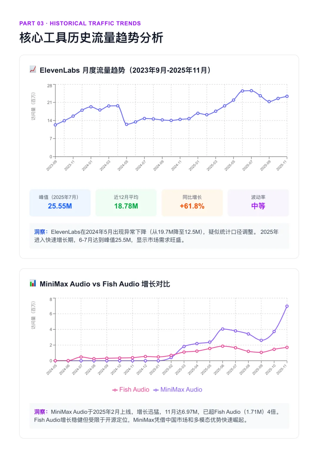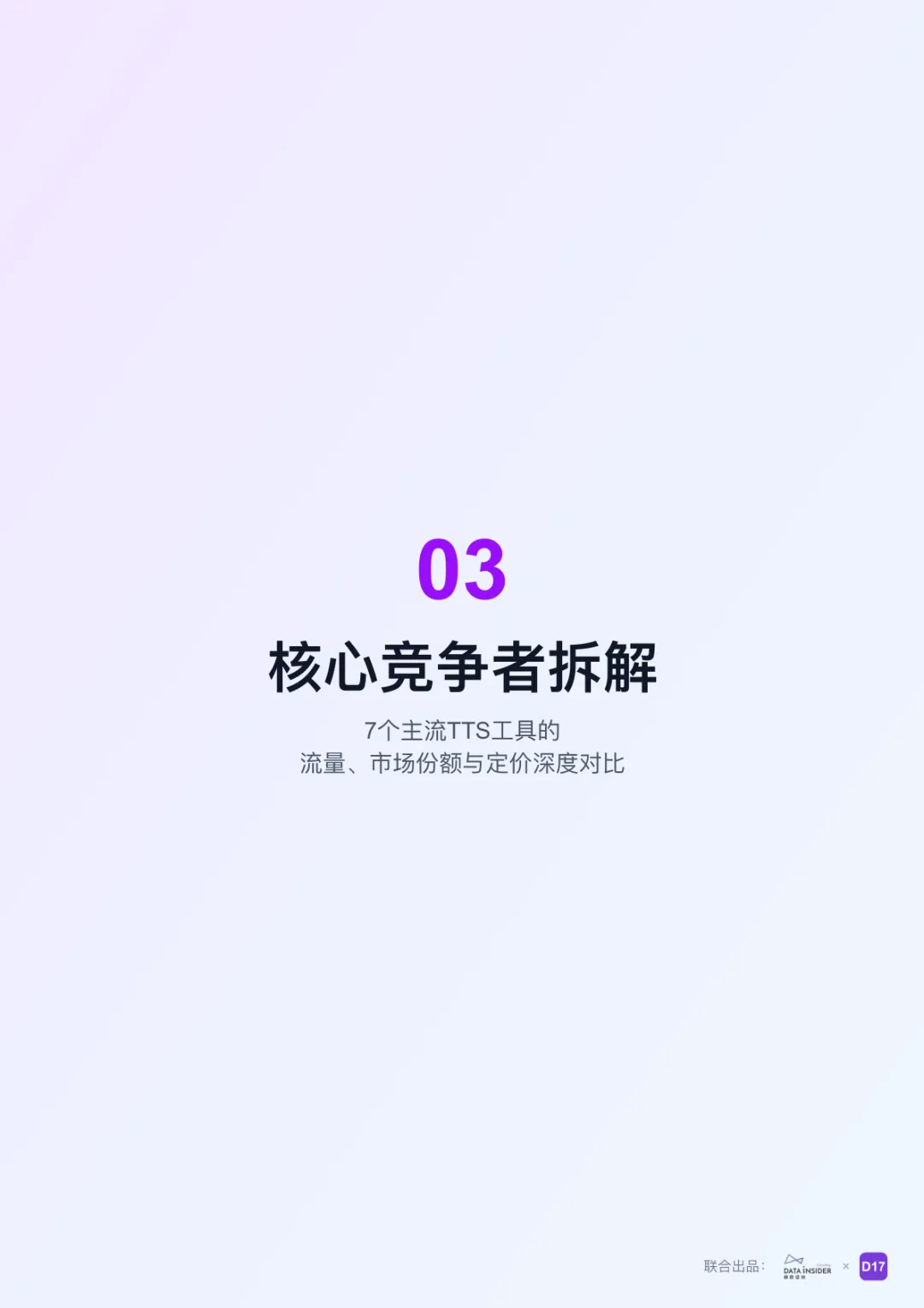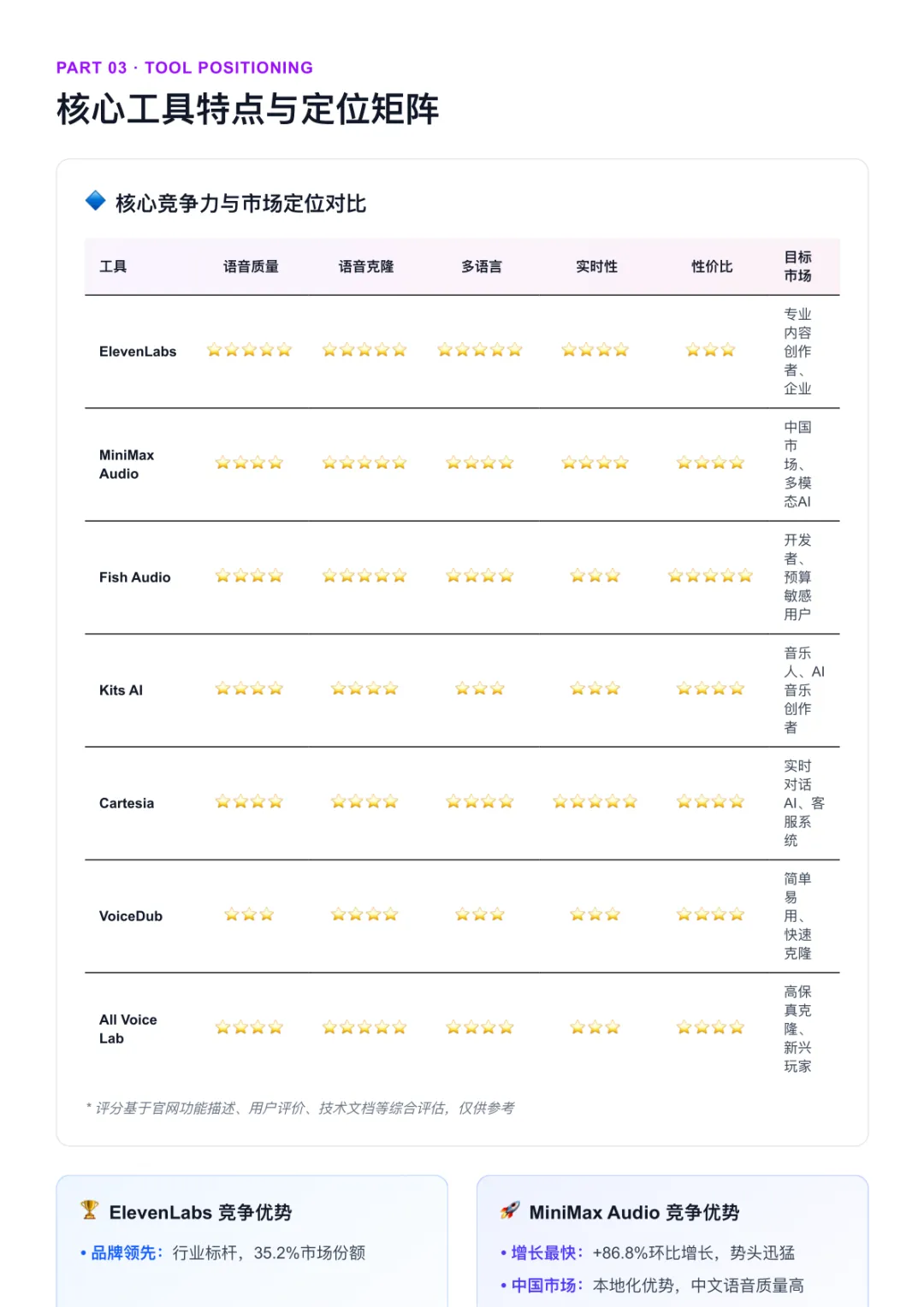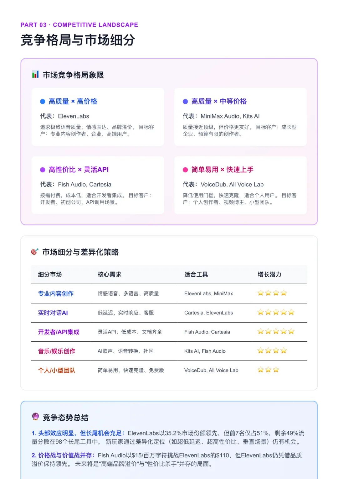 导读:报告聚焦全球 AI 语音合成市场现状、竞争格局与未来趋势,基于 105 款工具、13 亿月度访问量数据,提供全面行业洞察。2024 年全球 TTS 市场规模达 40 亿美元,2025 年预估增长 24% 至 49.6 亿美元。语音克隆作为高端细分领域表现突出,2024 年规模 24 亿美元,预计 2030 年将达 96 亿美元,年复合增长率 28.4%。北美市场占比 37.2% 主导行业,亚太地区凭借数字化转型需求成为增速最快区域。市场呈现 “一超多强” 格局,ElevenLabs 以 35.2% 市场份额领跑,MiniMax Audio 凭借中国市场优势与多模态功能快速崛起。工具功能集中于文本转语音与语音克隆,多模态融合、低延迟、情感化成为技术创新方向。应用场景覆盖内容创作、智能客服、教育培训等,未来零样本语音克隆与行业专用模型将加速普及。