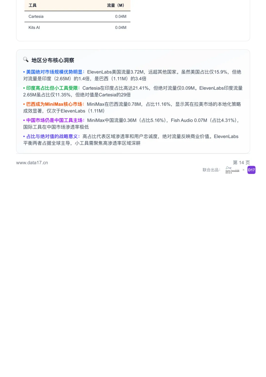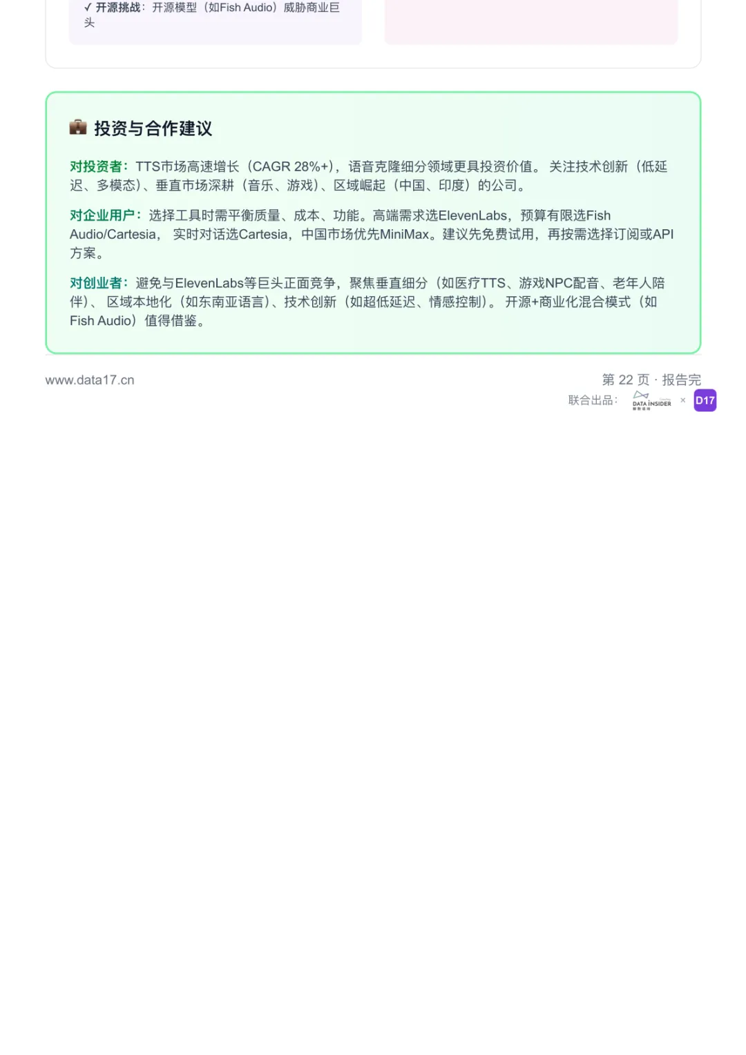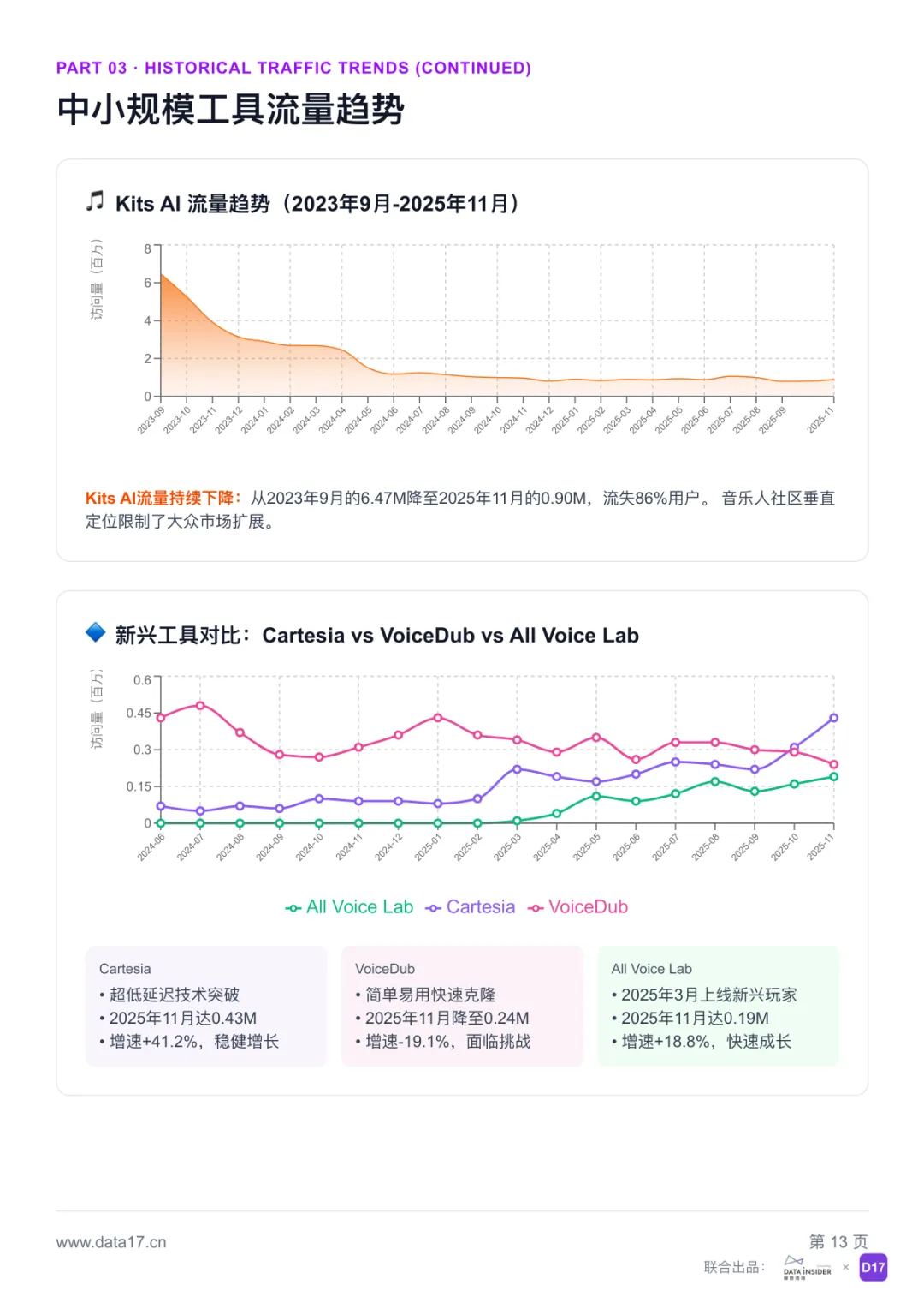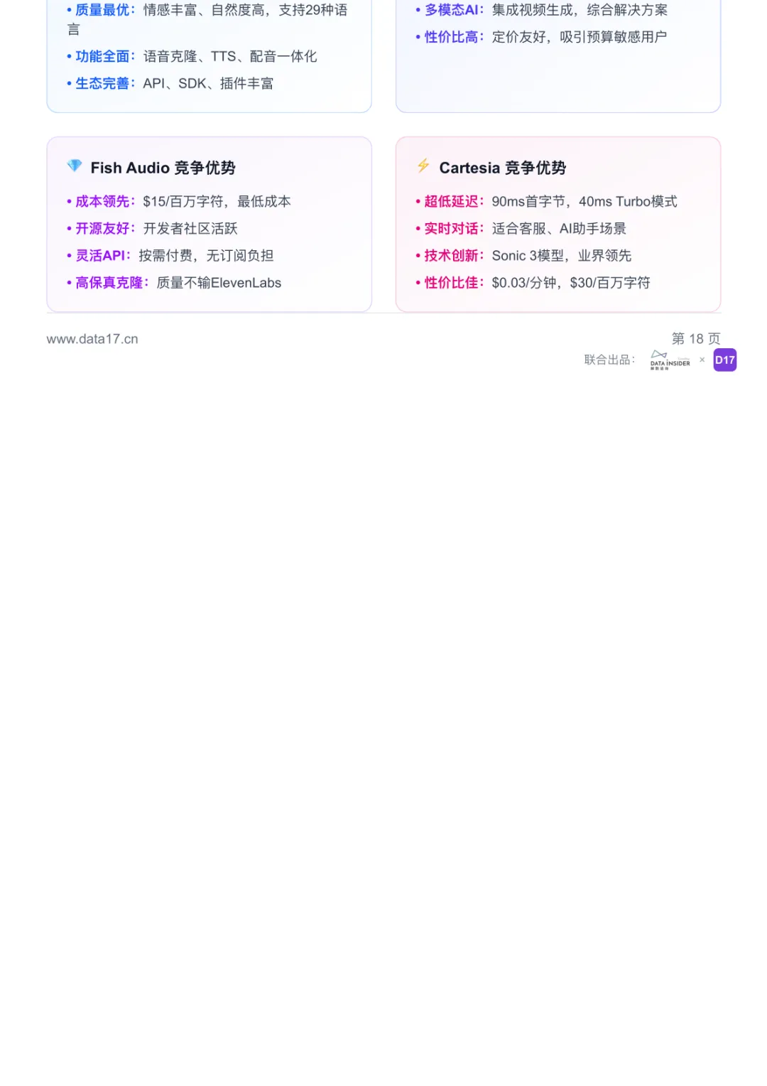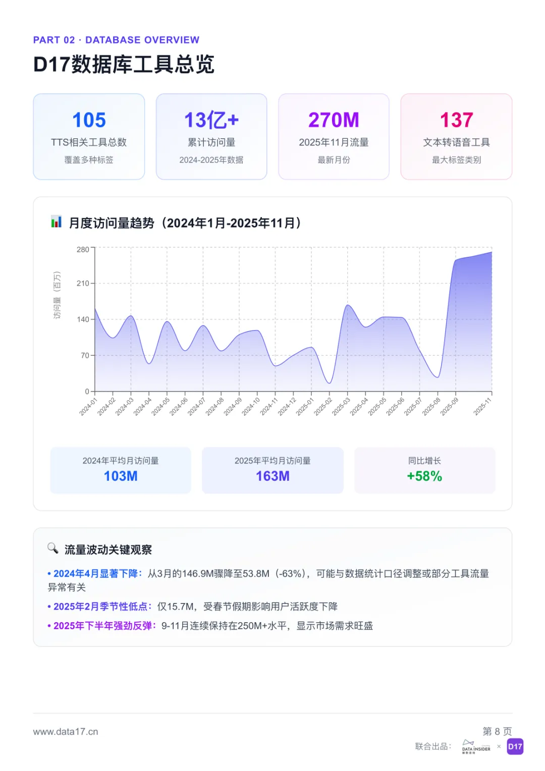 导读:报告聚焦全球 AI 语音合成市场现状、竞争格局与未来趋势,基于 105 款工具、13 亿月度访问量数据,提供全面行业洞察。2024 年全球 TTS 市场规模达 40 亿美元,2025 年预估增长 24% 至 49.6 亿美元。语音克隆作为高端细分领域表现突出,2024 年规模 24 亿美元,预计 2030 年将达 96 亿美元,年复合增长率 28.4%。北美市场占比 37.2% 主导行业,亚太地区凭借数字化转型需求成为增速最快区域。市场呈现 “一超多强” 格局,ElevenLabs 以 35.2% 市场份额领跑,MiniMax Audio 凭借中国市场优势与多模态功能快速崛起。工具功能集中于文本转语音与语音克隆,多模态融合、低延迟、情感化成为技术创新方向。应用场景覆盖内容创作、智能客服、教育培训等,未来零样本语音克隆与行业专用模型将加速普及。