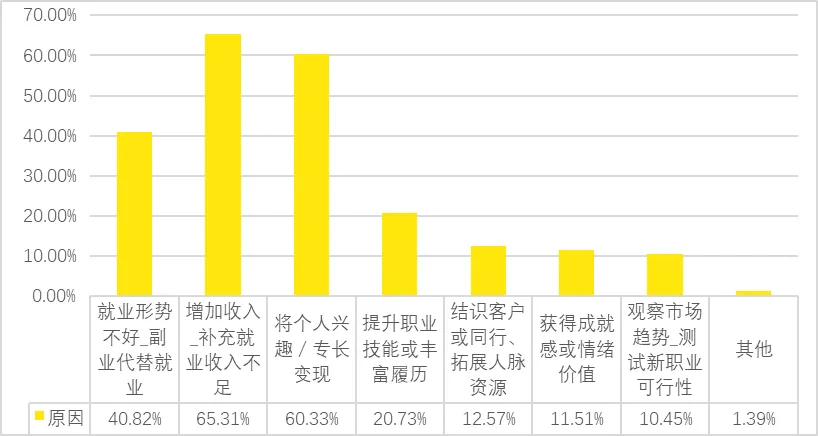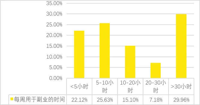 闲鱼副业板块正处于“泛职业化”早期阶段,一部分人轻度尝试,一部分人重度深耕。一项针对1225位闲鱼平台副业从业者的问卷调研显示,65.31%的参与者将“增加收入、补充主业不足”视为主要动因。41.11%受访者表示副业收入占其月收入超过30%,其中,16.49%副业收入占比超过70%。每周在平台从业30小时的用户占比达29.96%,几乎与“兼职”或“第二主业”无异。