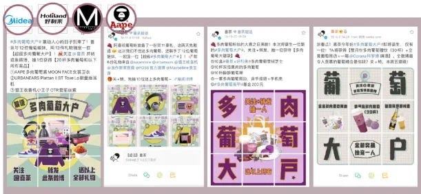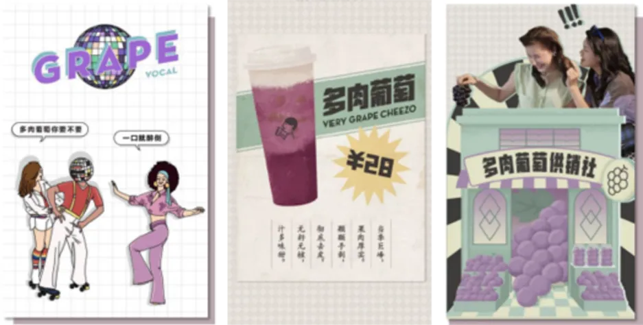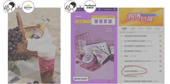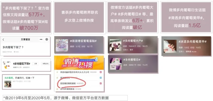 借助热销产品的原料短缺“小气候”和饮品暂时下架的契机,利用营销传播手段的引导,让消费者将“多肉葡萄下架”的话题推上微博热搜,从而使明星产品华丽转身, C位出道。跨界联合其他品牌,玩转“多肉葡萄”味道上的多样可能。与啤酒品牌“科罗娜”进行绑定,以“醉”为概念,推出新颖多肉葡萄茶酒系列。推出系列新颖搭配,抢占消费者的味蕾与喜爱,跨界肉葡萄雪融芝士、层层爆浆蛋糕等,引起巨大反响,用味道层层圈粉,冲向新浪微博热搜,单品月销量约达到40万。(1)色彩出圈第一波造势:体现“喜茶”强设计力的一系列“多肉葡萄紫色”海报,成功强化了消费者对于产品色号的记忆点。(2)色彩出圈强助力:集结12家流行品牌同款色号产品,推出#多肉葡萄大户#抽奖,让品牌色号风靡一时。远超“提高产品销量30%”的目标:2019年1月多肉葡萄月销量86万杯,12月单月销量突破200万。“多肉葡萄”项目总曝光量超过10亿,总计微博互动数超500万,引发热烈讨论。在60天内,“多肉葡萄”相关信息冲上微博热搜2次。“喜茶”官方微信相关推送阅读量突破10万。案例二:奈雪CUP美术馆