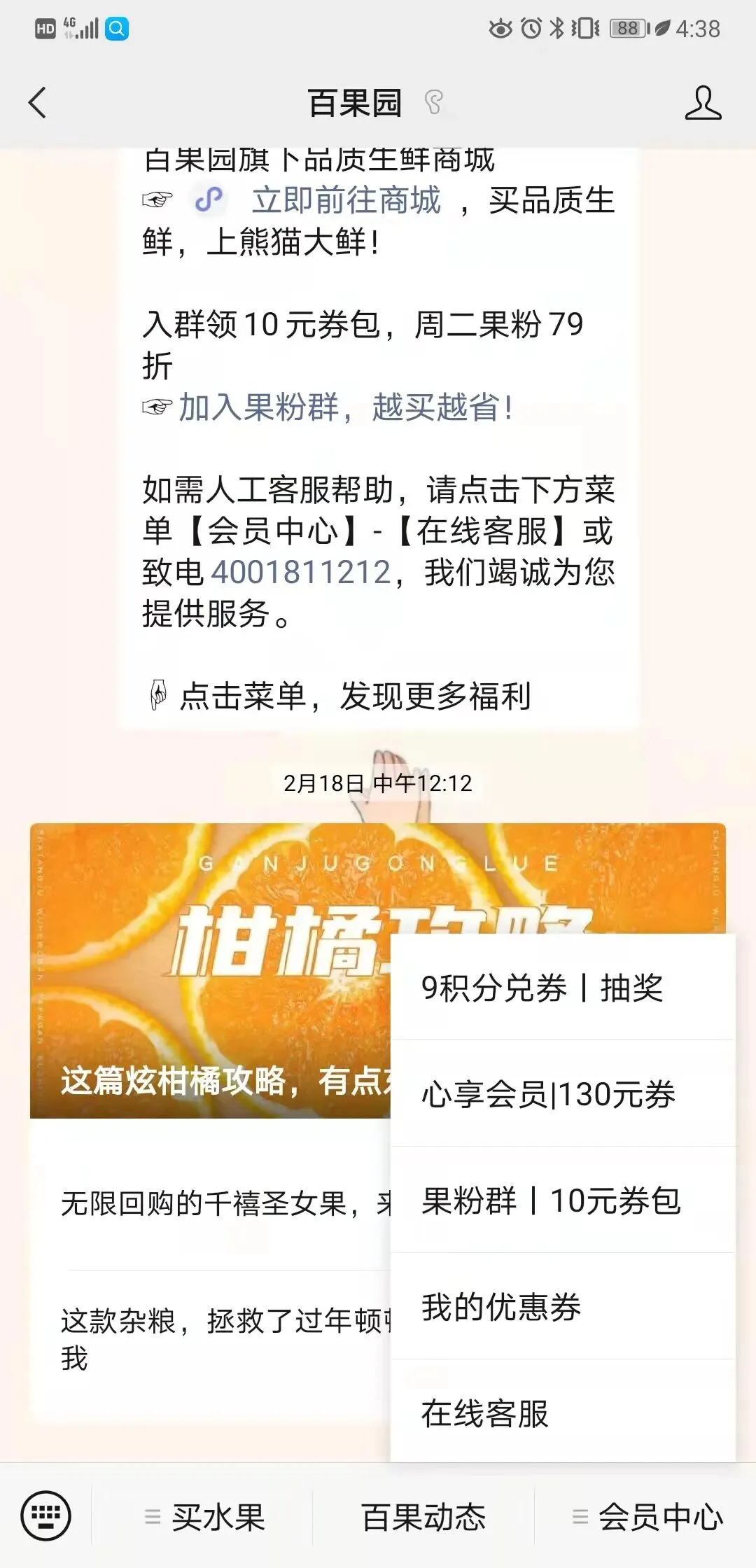 公众号目前百果园的公众号主要功能有购买蔬果、会员中心的入口