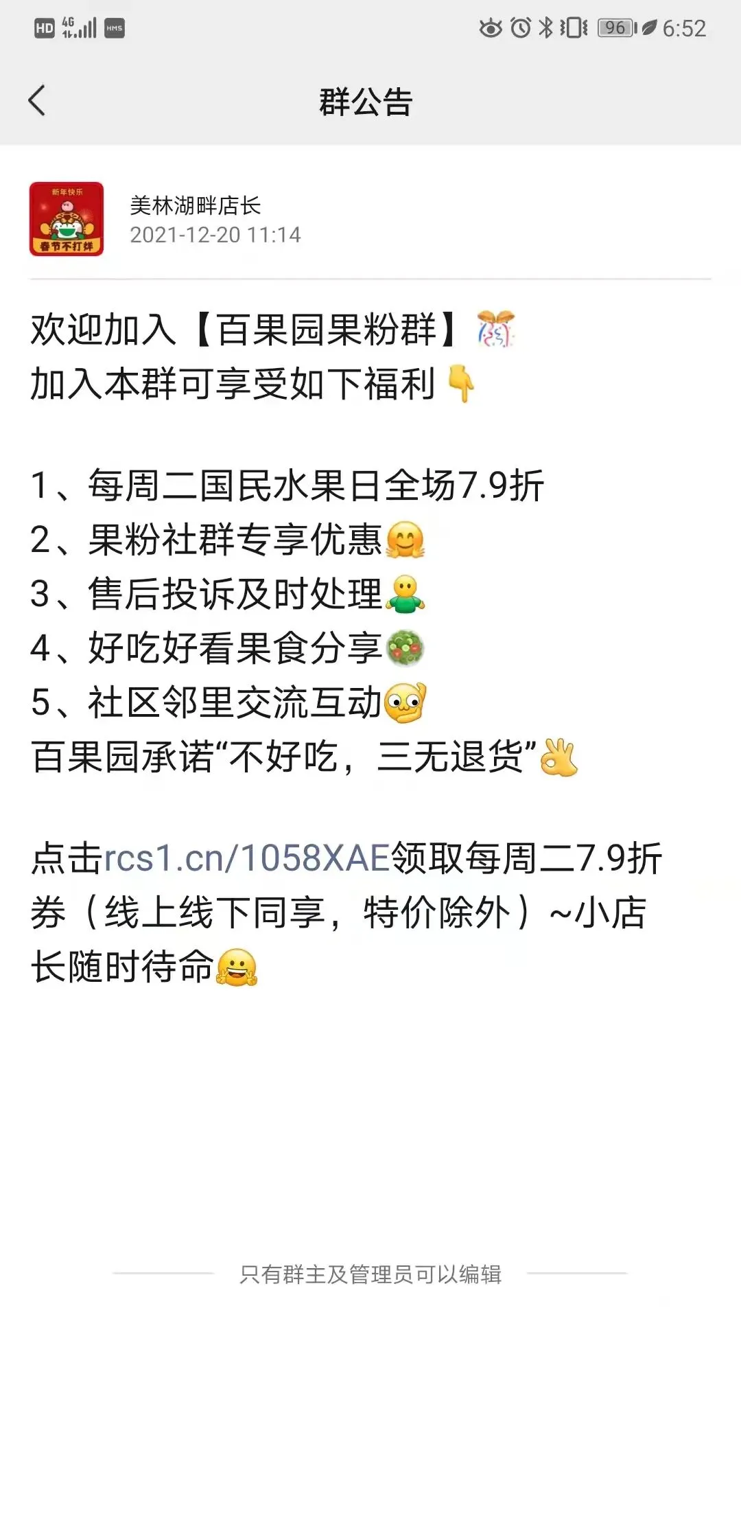 社群内发布活动的为百果园福利官,角色分明,刚入群时,可领取35元优惠券。
