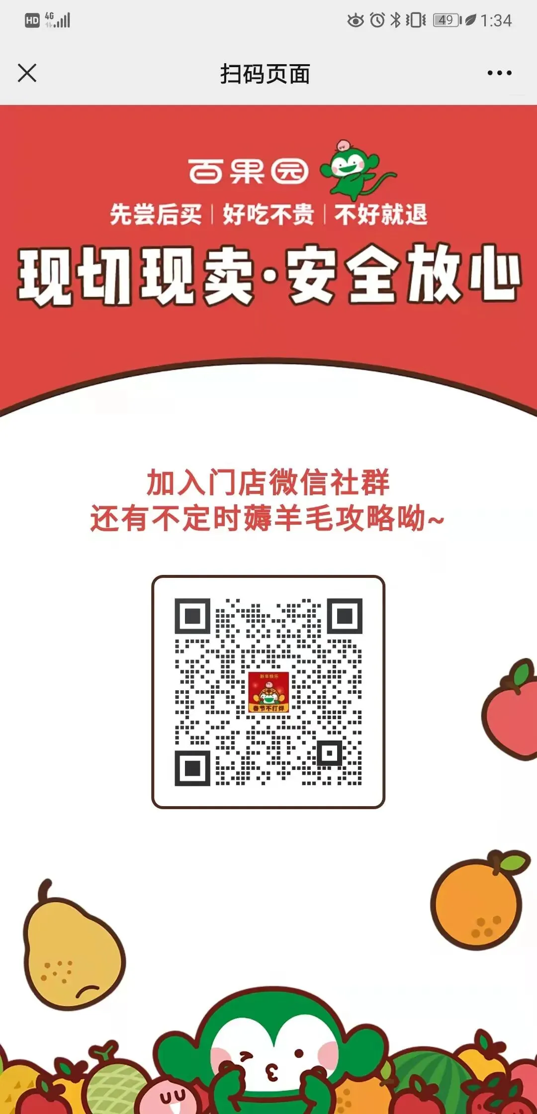 进入门店后会先看到所在区域百果园的门店活动(与店员了解到区域不同门店活动也有不同,比如逛走区域的活动是每周二79折,不同地区的活动由百果园总部安排)--结账时店员会引导用户添加企业微信--添加企业微信后邀请入群--进入百果园门店会员群