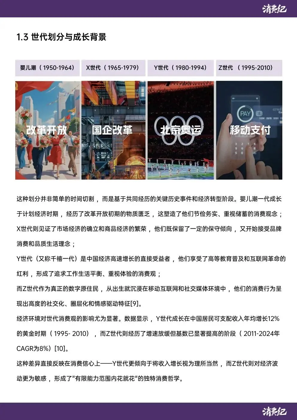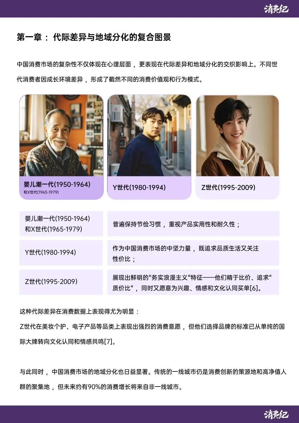 报告分析了不同世代消费者的差异化特征:婴儿潮和X世代更关注产品的功能性价值,而Z世代(1995-2009年出生)偏爱“情感驱动型消费”,重视社交属性和个性表达。消费理念上,从 “性价比” 转向 “质价比” 与 “心价比” 双重评估,前者重质量与全生命周期成本,后者聚焦情绪价值,不同世代偏好各异。