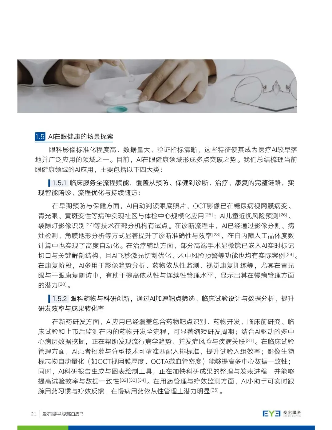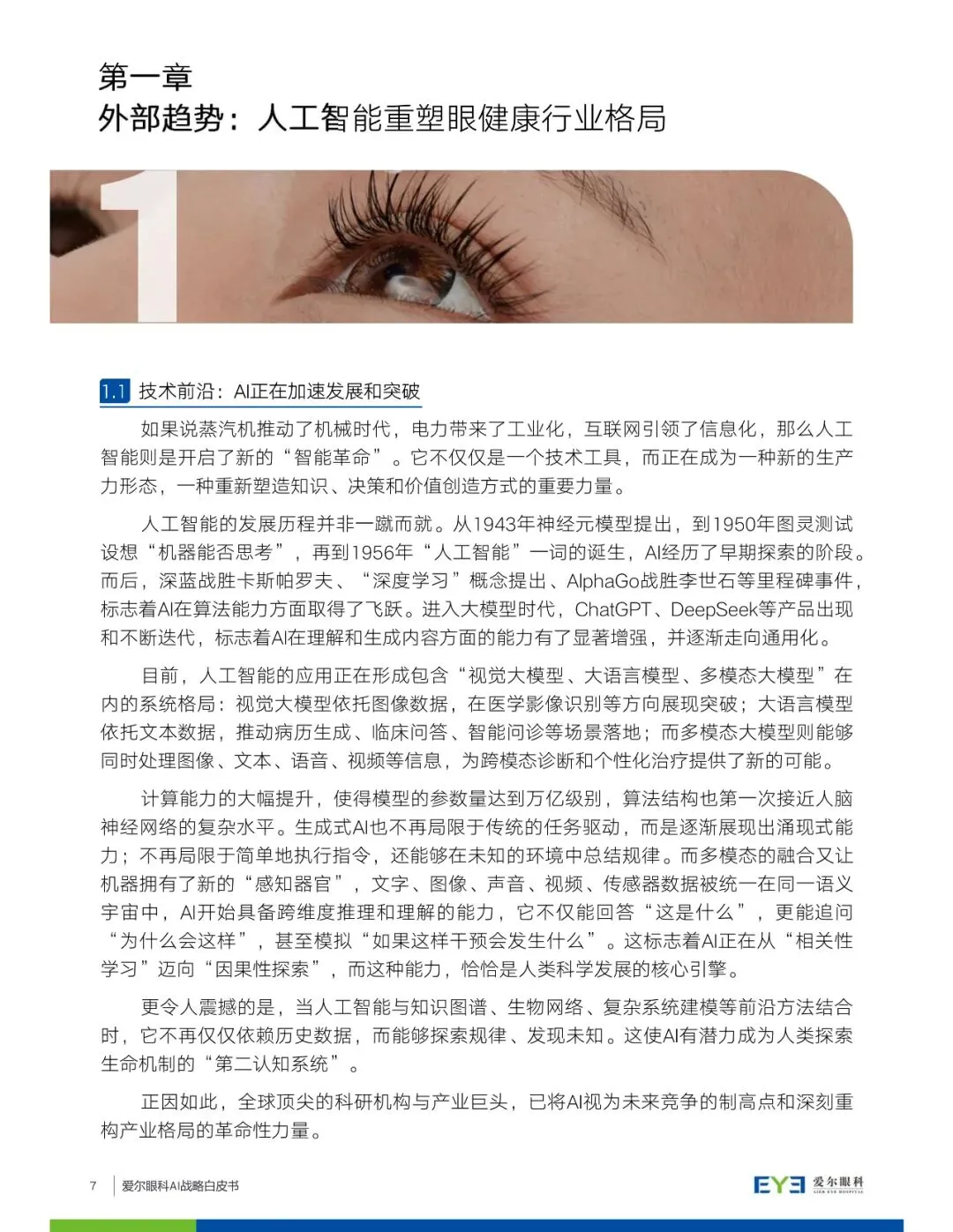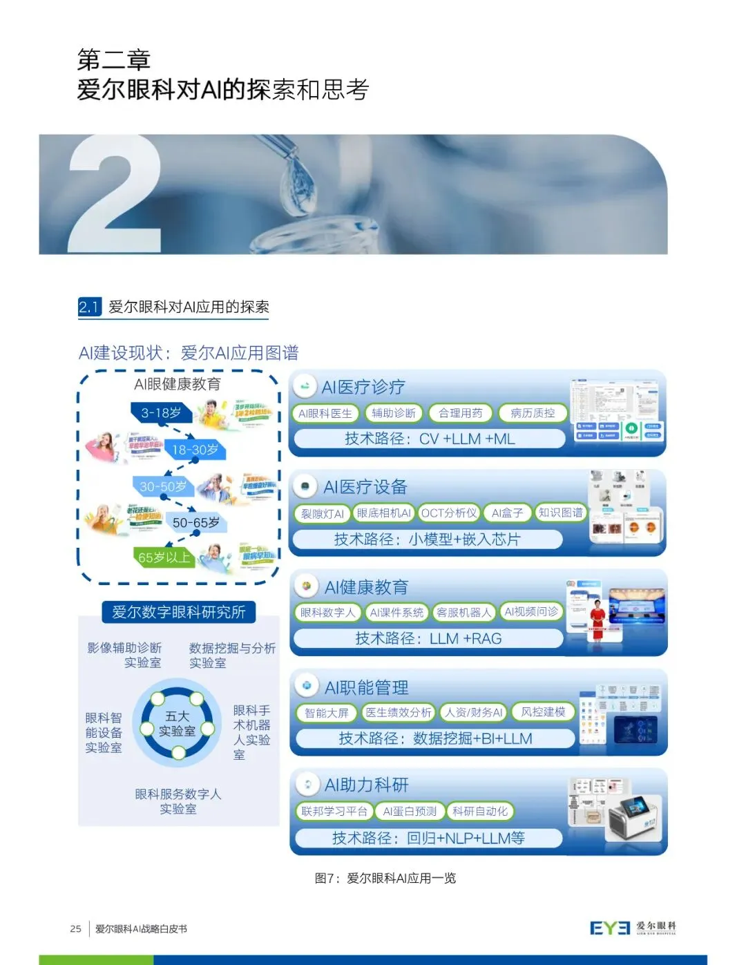 白皮书详细介绍了爱尔眼科在AI领域的探索和思考,包括AI技术在眼健康领域的应用场景探索,如临床服务全流程赋能、眼科药物与科研创新、智能设备与家庭终端赋能等。同时,爱尔眼科提出构建AI应用的全景版图,涵盖从预防、保健到诊断、治疗、康复的完整链路,并强调数据基座、AI技术与平台、AI治理作为战略基座的重要性。
