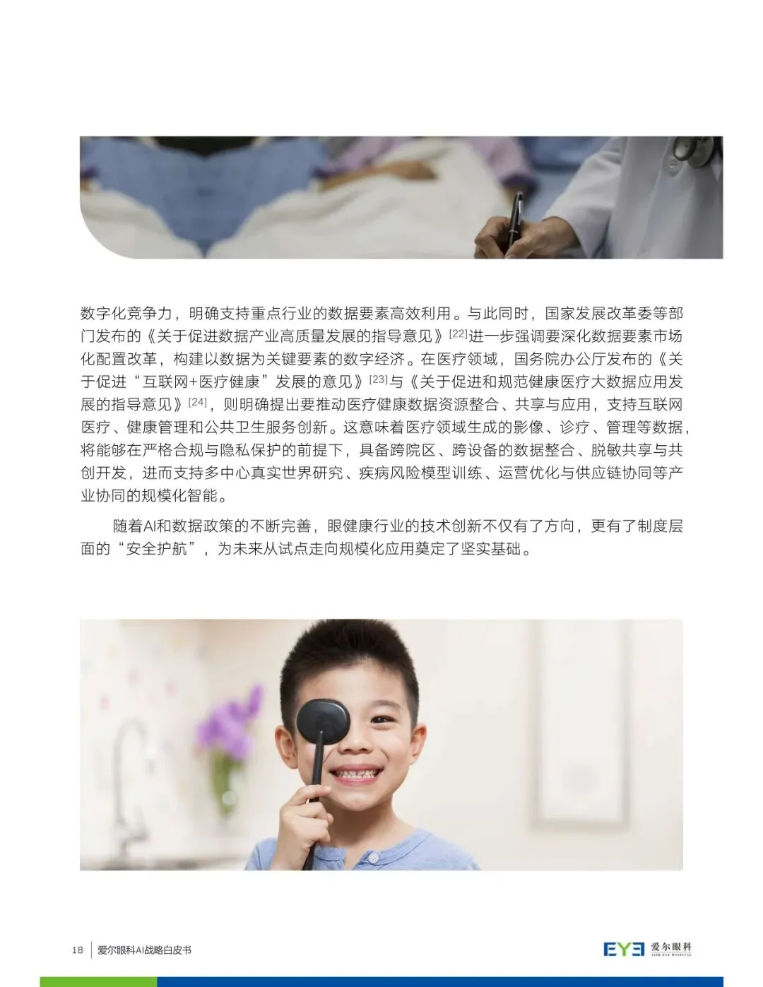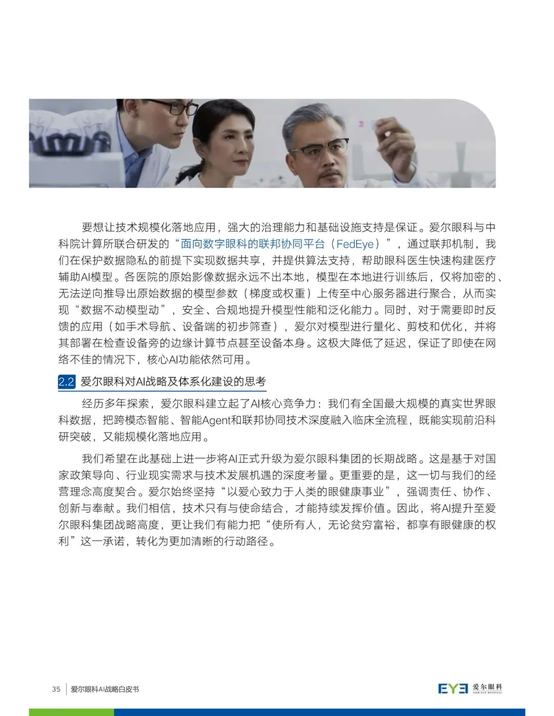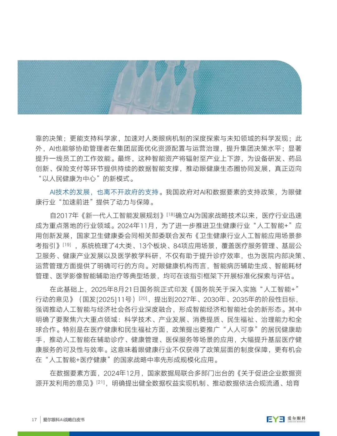 白皮书详细介绍了爱尔眼科在AI领域的探索和思考,包括AI技术在眼健康领域的应用场景探索,如临床服务全流程赋能、眼科药物与科研创新、智能设备与家庭终端赋能等。同时,爱尔眼科提出构建AI应用的全景版图,涵盖从预防、保健到诊断、治疗、康复的完整链路,并强调数据基座、AI技术与平台、AI治理作为战略基座的重要性。