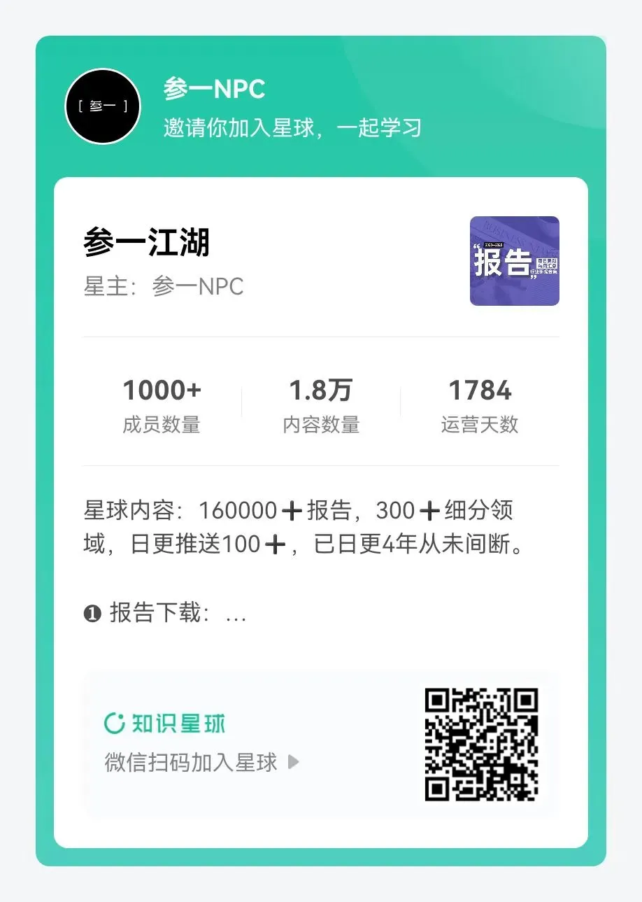 (每日分享最新重磅报告,与投资人、创业者、行业研究员、企业高管等群成员互动交流,实现人脉拓展、资源对接、项目合作等)
