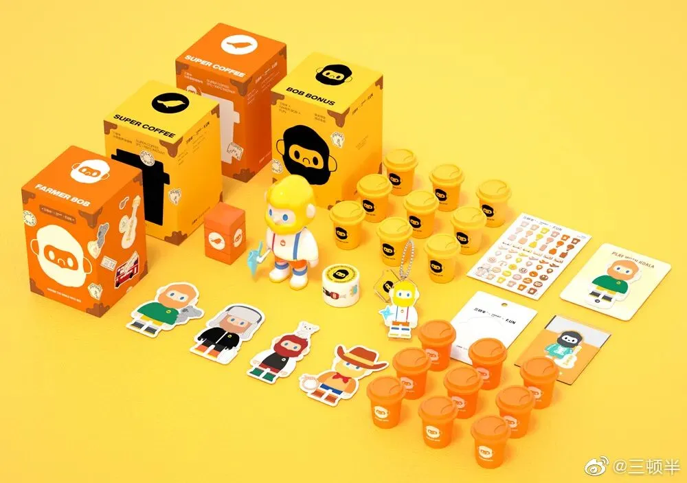 与文创IP WHIKO谜之生物联名,推出咖啡、徽章、贴纸礼盒;