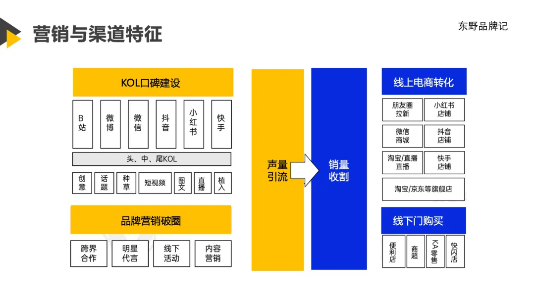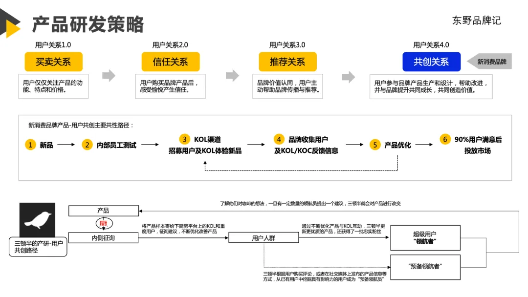 A-引起注意(Attention):新品启动,培育用户针对目标用户,三顿半选择了美食生活APP-下厨房,用将产品样本寄送给平台上的KOL和重度用户,征询建议,不断优化改善产品。在新品研发阶段就让用户参与进来。针对大众用户,三顿半选择了两个微博博主——张特价和野生珍妮合作,透过vlog镜头讲述三顿半的咖啡空罐“返航”故事,瞬间引起了用户的注意。除了KOL,三顿半还和KOC保持紧密合作。在2018年产品推出的时候,三顿半就从微博、小红书等社交平台上挑选具有典型特征的KOC:他们既有身在东京的书籍装帧师、旅居巴黎的自由插画师、东京蓝带糕点技工师傅、也有世界咖啡杯测大赛的中国冠军,他们有大V、有素人、有咖啡爱好者,三顿半将他们培养成品牌的种子用户,并授予他们“领航员”的称号。正是借助这群KOC在各自圈层积攒的影响力将三顿半辐射到不同的圈层,从而助推新产品的冷启动上市。针对咖啡爱好者,三顿半选择参加咖啡界的“奥运会”——上海国际咖啡展。2018年,三顿半带着冷萃超即溶咖啡1号、2号和3号产品参展。“3秒完全溶解+新鲜冷萃风味”的核心亮点,吸引了约2000位专业人士试喝,他们的认可让三顿半对自己的新品有了信心。在展会结束5个月后,三顿半正式入驻天猫旗舰店,并成为阿里新国货计划的扶持对象。2019年,三顿半带着1号、2号、3号、4号、5号、6号超级还原产品进行组合,形成了用数字1~6号表达10%烘焙差异度的超级咖啡系列,还加上了Demo版的单一产地新品0号咖啡。在展会期间,冲泡了3000杯咖啡进行新品公测,吸引了众多咖啡爱好者和专业人士,他们提出了不少建议,给三顿半带来了很多灵感和启发。I-激发兴趣(Interest):跨界联名,1+1>22018年