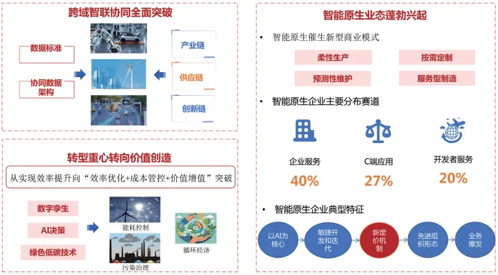 一是跨域智联协同全面突破。行业智能体加速落地应用;二是智能原生业态蓬勃兴起。企业逐步摆脱传统数字化改造路径依赖,以人工智能、大数据等智能技术为原生基因,重构业务模式与生产流程;三是转型重心转向价值创造。产业数字化转型从单纯追求效率提升转向“效率优化+成本管控+价值增值”多维突破。