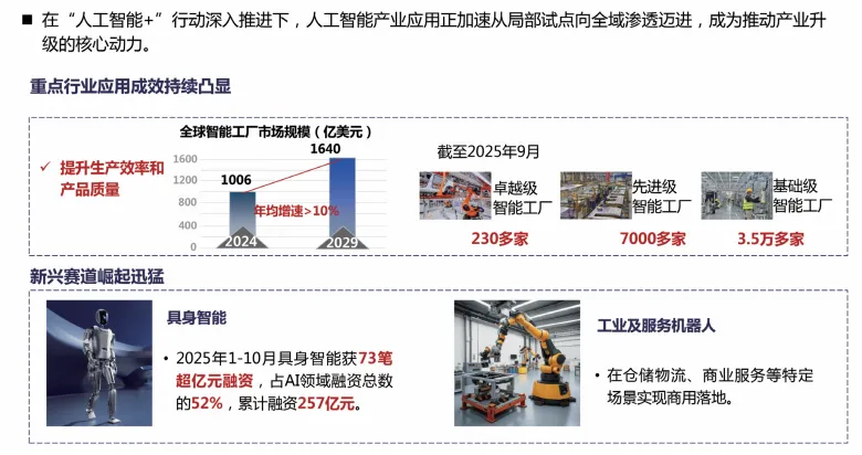 一是新领域新赛道场景加速新兴技术大规模产业化进程。以新一代智能终端、智能体为载体的高价值新应用新场景加快拓展,催生智能工厂、自主调度、无人配送、智慧农场等一批高成长性新产业新赛道。二是行业“人工智能+”技术创新将由试验探索走向规模化应用;三是数字产业集群梯度培育将深入探索。