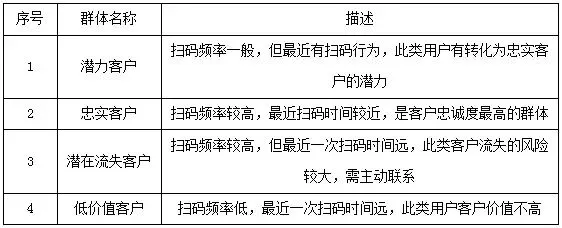 运用扫码数据对用户进行RF模型分析,对客户进行细分。其过程为:R为最近一次购买距离观测期末的时长,F为观测期内的总购买次数。R和F两个维度的阈值分别设置为60天、10次,在全观测期末将所有消费者分为如下四个类别: