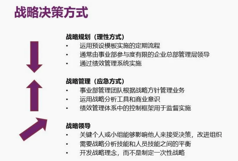 :由高层领导团队制定,强调愿景驱动。 优点:提供长期展望,确保协作效应。 缺点:灵活性差,可能基于错误假设。