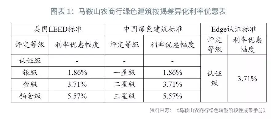 马鞍山农商行的绿色建筑按揭贷款(产品名称为“绿色住房按揭贷”),是面向个人客户和家庭购买我国星级绿色建筑、美国LEED建筑认证、IFC的Edge认证的绿色建筑提供的按揭贷款。该产品主要有三个特色:一是给予绿色建筑按揭贷款利率优惠,二是同时可以配比绿色消费贷款用于购买绿色家居产品,三是提前还款可以免收违约金,其目的是鼓励客户更多购买绿色住宅产品。根据其2018年发布的《马鞍山农商行绿色转型阶段性成果手册》,该行在绿色建筑评价标准的基础上搭建起了不同绿色建筑等级的差异化优惠体系。绿色建筑按揭贷款首付比例与普通住宅一致,但可以享受利率优惠(见图表1)。