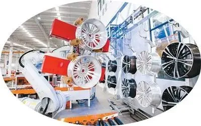 安徽今飞轮毂有限公司的智能化车间内,六条全自动化产线高效运转,工人有序协作,一批批新能源汽车轮毂顺利下线。张军 摄