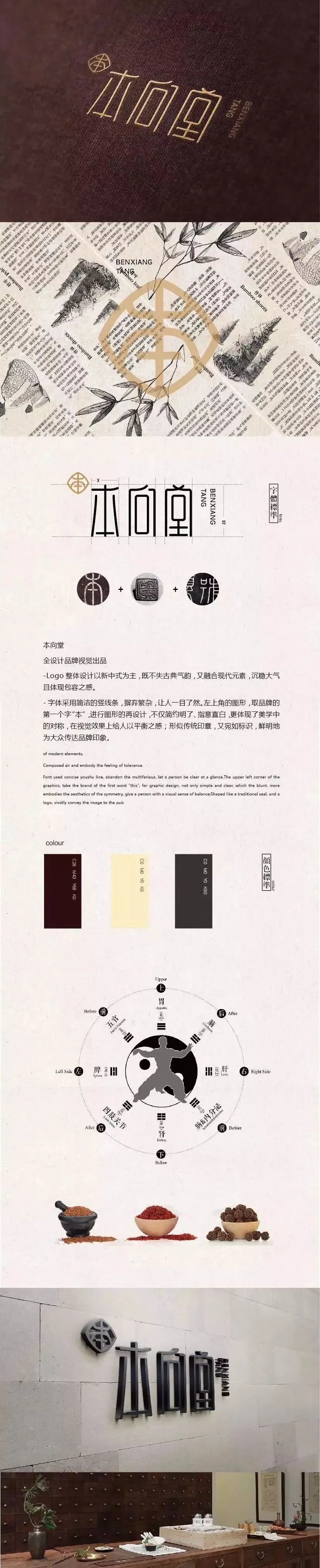 《本向堂》是一家以传承古方、草本养生的企业,所以在设计的时候元素采用利落纤长的线条,将古典元素融于现代,创造令人耳目一新的品牌文化,视觉上纯粹鲜明,符合对称美学,大气之余不失质感,凸显“本”心。