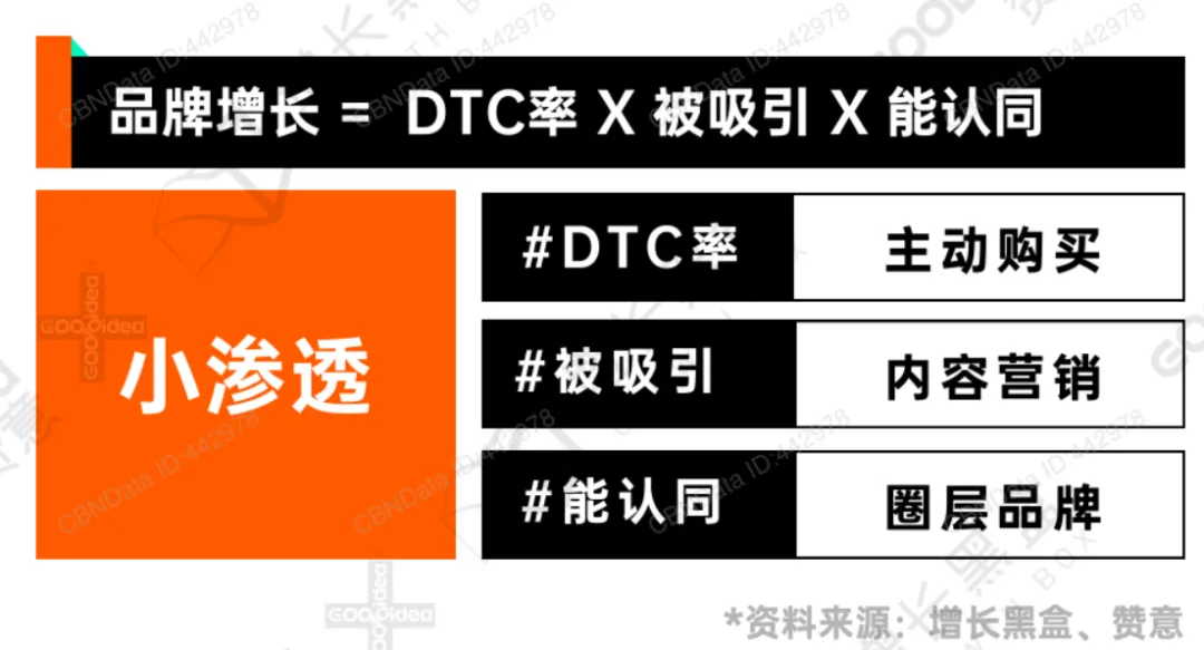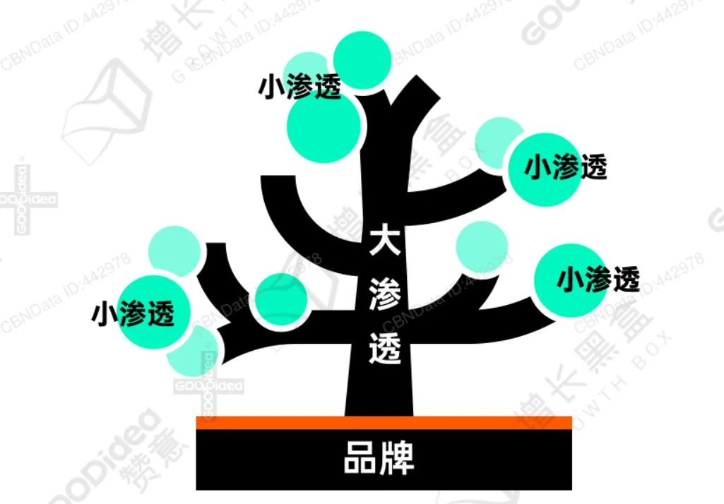 所谓的小渗透,指的是在品牌成长期,把有限的资源聚焦在媒介投放,在产品端提高产品附加值,在营销端通过品牌故事深度运营用户心智,最终建立品牌purose,以品牌purpose为指引渗透圈层人群。