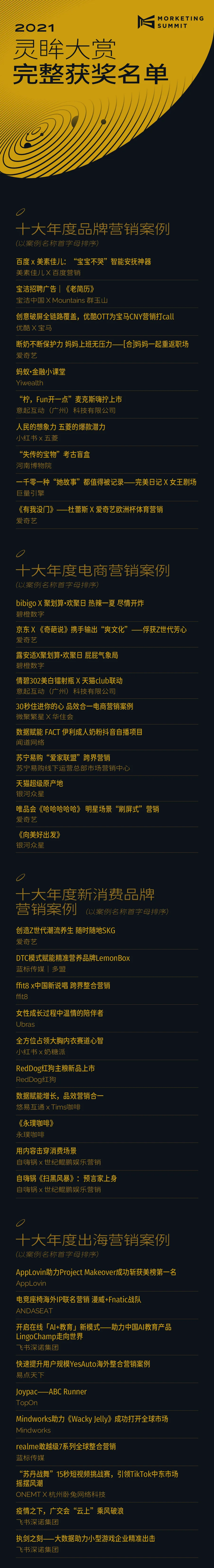 当前,整个商业世界正在从“数字化”到“数智化”的演变进程中。“数字化”是技术的发展,“数据化”是数据分析与技术的应用,“数智化”是数据智慧化与智慧数字化的结合。基于这一洞察,灵眸奖立足于“数字智能驱动商业创新”,是Morketing基于其“移动、数据、技术”基因推出的,立足全球视野,鼓励商业创新的行业奖项。致力于在全球范围内,找寻且鼓励驱动数字生态的优质案例与服务提供者,以推动中国数字营销商业发展、促进中国商业有大的全球格局为使命。自奖项创办至今,以强大的评委阵容、专业的评审标准、客观中立的评审流程,成为行业内权威奖项之一,并起到了行业发展风向标的重要作用。本届灵眸奖共收到申报案例222个,涉及汽车、快消、家具、美妆、食品酒饮、游戏等多个品牌领域,申报方包括品牌方、主流互联网平台及营销服务机构、商业创意机构。222个案例共计产生408次奖项申报,涉及品牌类、电商类、出海类、游戏类、创意类、技术类等奖类。本届灵眸奖共计将产生各类奖项93个,平均获奖率约为22.8%;部分奖类竞争激烈,获奖率不足10%。本届灵眸奖分别设置了线上初审及线下终审环节,共计56位评审参评。在终审过程中,基于对入围终审环节所有案例的逐一讨论,最终通过评审票选的形式,确定最终获奖名单。对于部分未能达成意见统一、或出现投票结果并列的情况,现场及线上所有评审本着严格、审慎、负责的态度,会对争议案例进行二次复议并进行新一轮票选。最终历经6个小时,在线上、线下共计28位终审评委的共同见证下,2021年度“灵眸大赏”奖项的榜单类及单项奖获奖名单全部产生。
