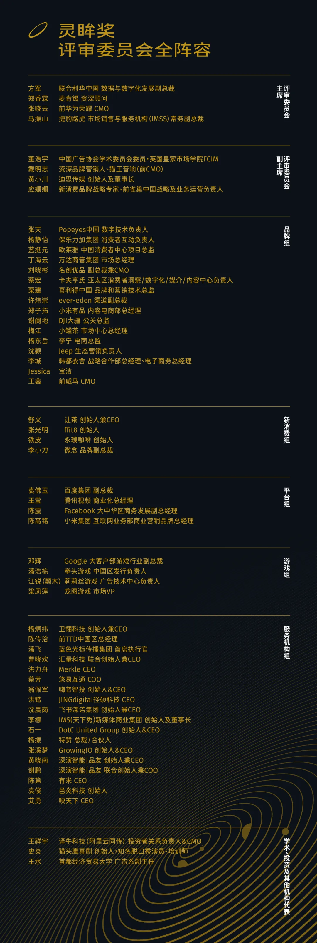 (联合利华中国数据与数字化发展副总裁方军为2021年度灵眸大赏全场大奖颁奖)2021 Morketing“灵眸大赏”评审委员会本届“灵眸奖”评审委员会成员分别来自MORKETING智库、资深营销从业者代表、品牌方代表,以及营销商业领域的其他各方参与者代表,成员名单如下: