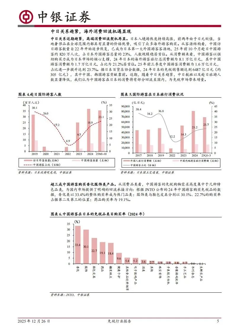 日本市场的消费动向也在影响国内免税的增量。2024年,日本的免税销售额达到了6487亿日元,折合人民币约305亿元,其中中国游客的贡献极为关键。2025年前三季度,中国游客在日本的旅行消费额达到1.6万亿日元,占比提升至23.7%,高居外国游客首位。这些游客最喜欢购买的品类依次是香化产品、服饰、鞋包皮具以及药品,购买率分别高达33.4%、30.1%、22.7%和19.1%。由于近期中日关系的变化,这部分庞大的海外消费需求有望回流至国内,为国内免税市场提供明确的增量空间。