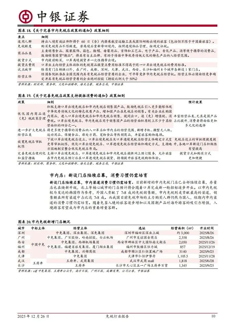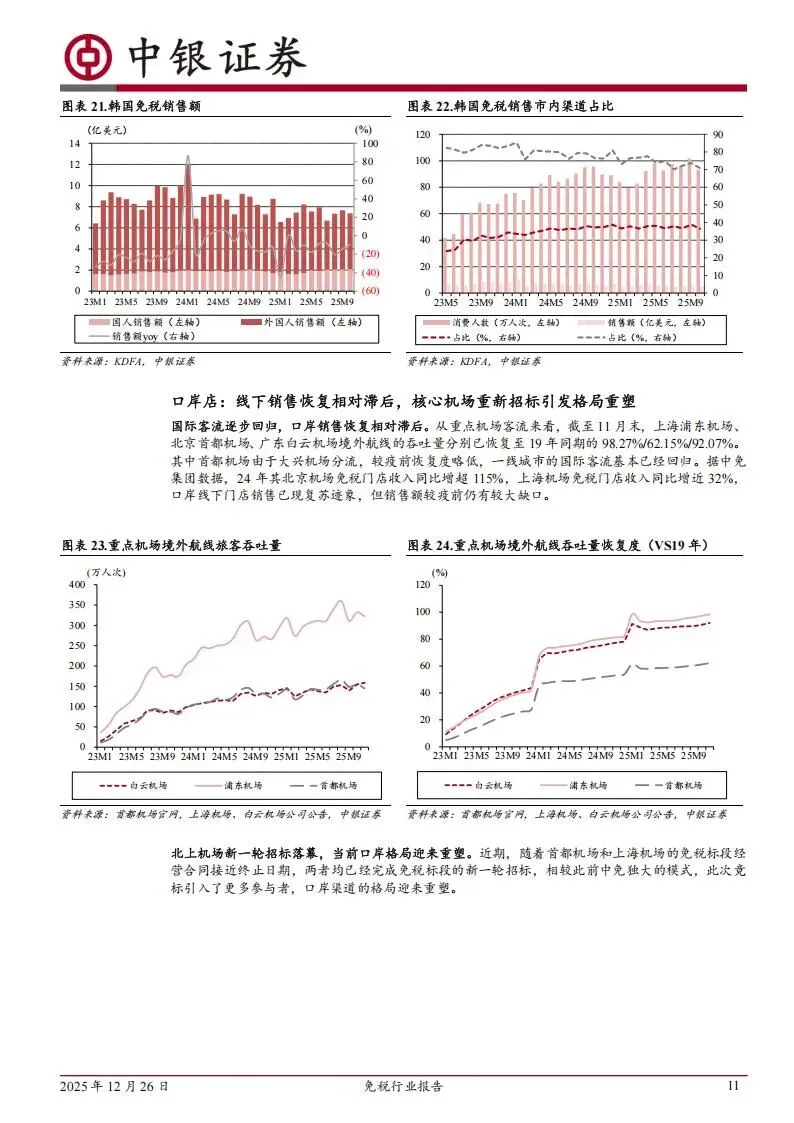 这些新设门店在2025年下半年密集开业。中免在深圳、广州、西安、福州、成都和天津的门店已相继投入运营,经营面积最大的成都店达到了3140平方米。王府井在武汉和长沙的门店也分别于6月和9月开启运营,经营面积均超过1300平方米。虽然目前国内市内店的消费习惯仍需培育,但参考韩国市场7-8成的销售额来自市内渠道的经验,随着免签政策的扩容和国货潮品对海外游客吸引力的增强,市内店有望成为未来免税市场的重要补充。