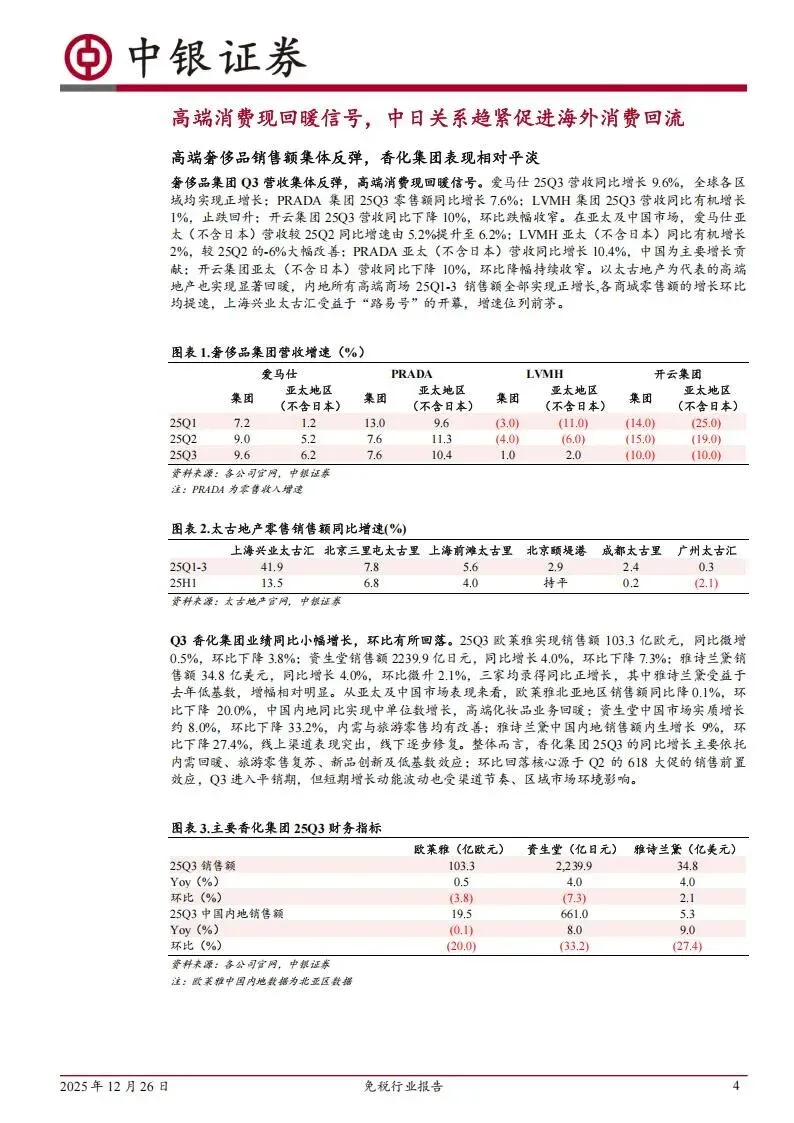 从全球范围来看,高净值人群的购买力正在重新活跃,爱马仕在2025年第三季度的营收同比上升了9.6%,其在除日本外的亚太地区增速从第二季度的5.2%提高到了6.2%。LVMH在相同地区的有机增长也从二季度的负6%大幅改善为正2%,这说明高端消费的复苏并不是个案。太古地产旗下的内地高端商场表现同样亮眼,上海兴业太古汇在2025年前三季度的零售额增长竟然高达41.9%,北京三里屯太古里也实现了7.8%的增长,这种实体商业的回暖直接为免税行业储备了客群。