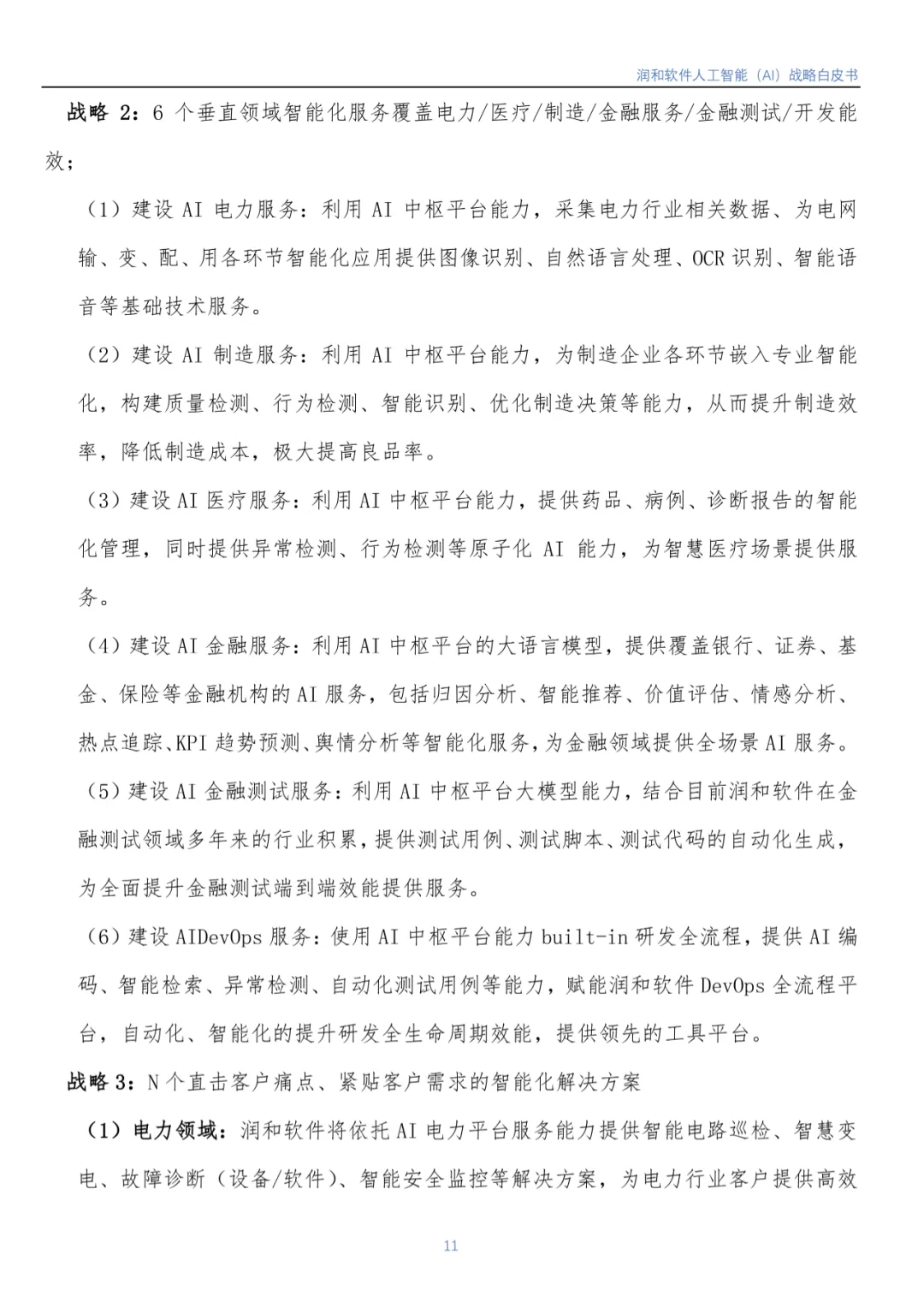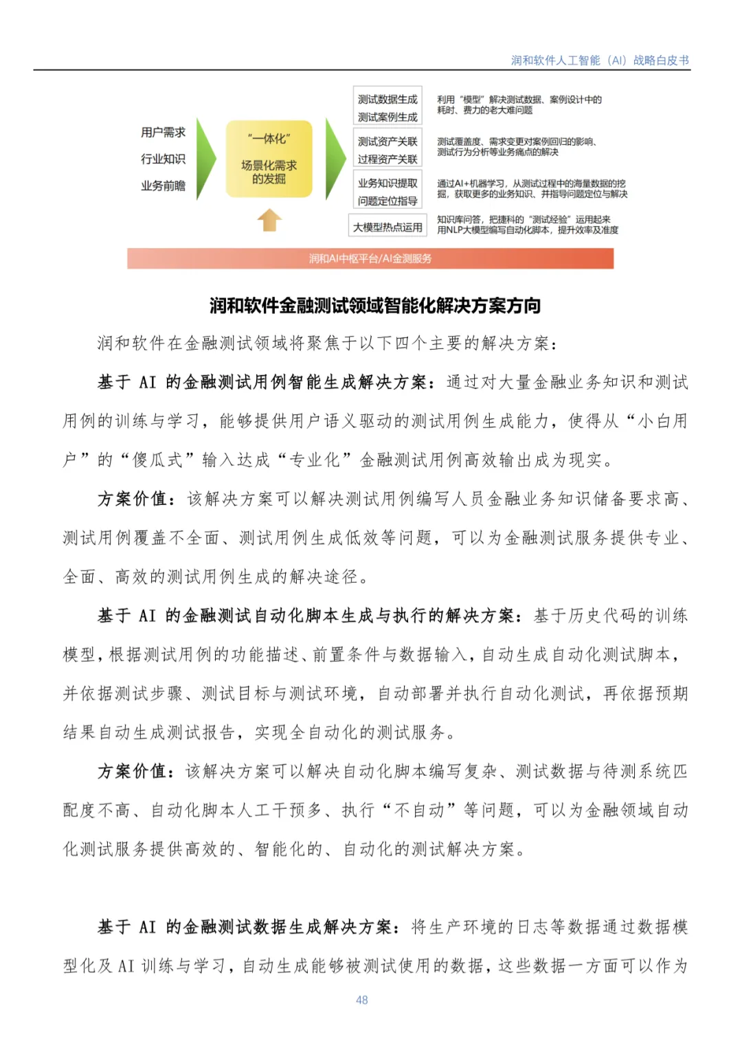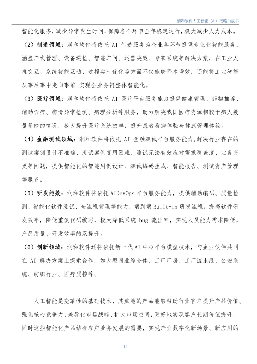随着人工智能市场的不断发展及国家各项宏观政策推进,IDC预计,2026年中国AI市场将实现264.4亿美元市场规模。润和软件认为人工智能市场后续仍然会处于高速发展的阶段,未来还有着巨大的潜力和机遇。《白皮书》重点介绍了润和软件人工智能1+6+N 发展战略: 即1个AI 中枢平台服务,6个垂直领域智能化服务覆盖电力/医疗/制造/金融服务/金融测试/开发能效,N个直击客户痛点、紧贴客户需求的智能化解决方案。润和软件将持续发挥技术领先优势,合力打造以场景应用为导向的发展模式,赋能行业变革与数智化升级。目前,该模式已在金融、电力、制造、医疗等领域获得了成功实践。