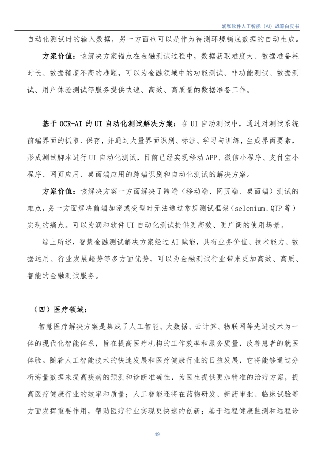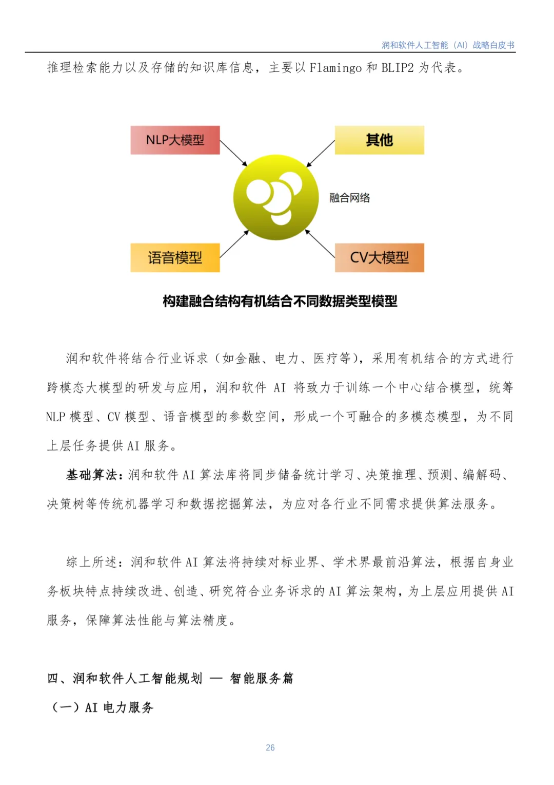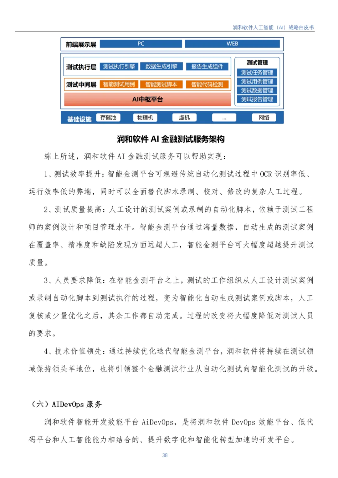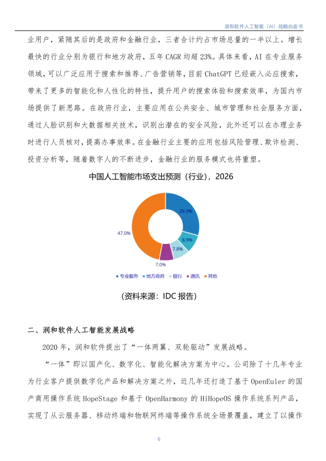 随着人工智能市场的不断发展及国家各项宏观政策推进,IDC预计,2026年中国AI市场将实现264.4亿美元市场规模。润和软件认为人工智能市场后续仍然会处于高速发展的阶段,未来还有着巨大的潜力和机遇。《白皮书》重点介绍了润和软件人工智能1+6+N 发展战略: 即1个AI 中枢平台服务,6个垂直领域智能化服务覆盖电力/医疗/制造/金融服务/金融测试/开发能效,N个直击客户痛点、紧贴客户需求的智能化解决方案。润和软件将持续发挥技术领先优势,合力打造以场景应用为导向的发展模式,赋能行业变革与数智化升级。目前,该模式已在金融、电力、制造、医疗等领域获得了成功实践。