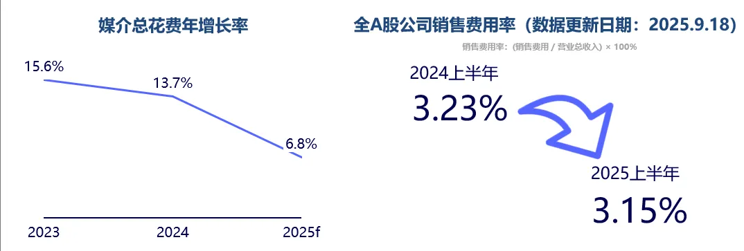 再来看媒介花费这一块,我们结合上半年的两组数据基本可以验证年初预测的“稳中求效”这一趋势。一是WPP Media于年中发布的最新一期《今年,明年-中国媒体行业预测》,其预测2025年国内媒介花费年增长率将从2024年的13.7%降低到6.8%。二是全A股数据,2025年上半年全A股公司销售费用率为3.15%,较2024年同期有所降低,销售费用率旨在衡量企业获得收入的效率,比值越低效率越高。