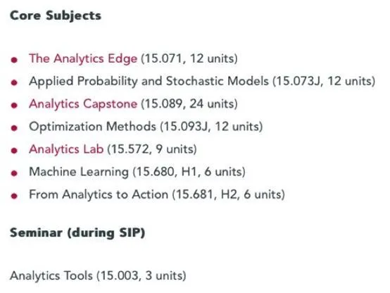(麻省理工学院商业分析项目的课程表,数据分析和计算机编程等内容占据绝大多数)