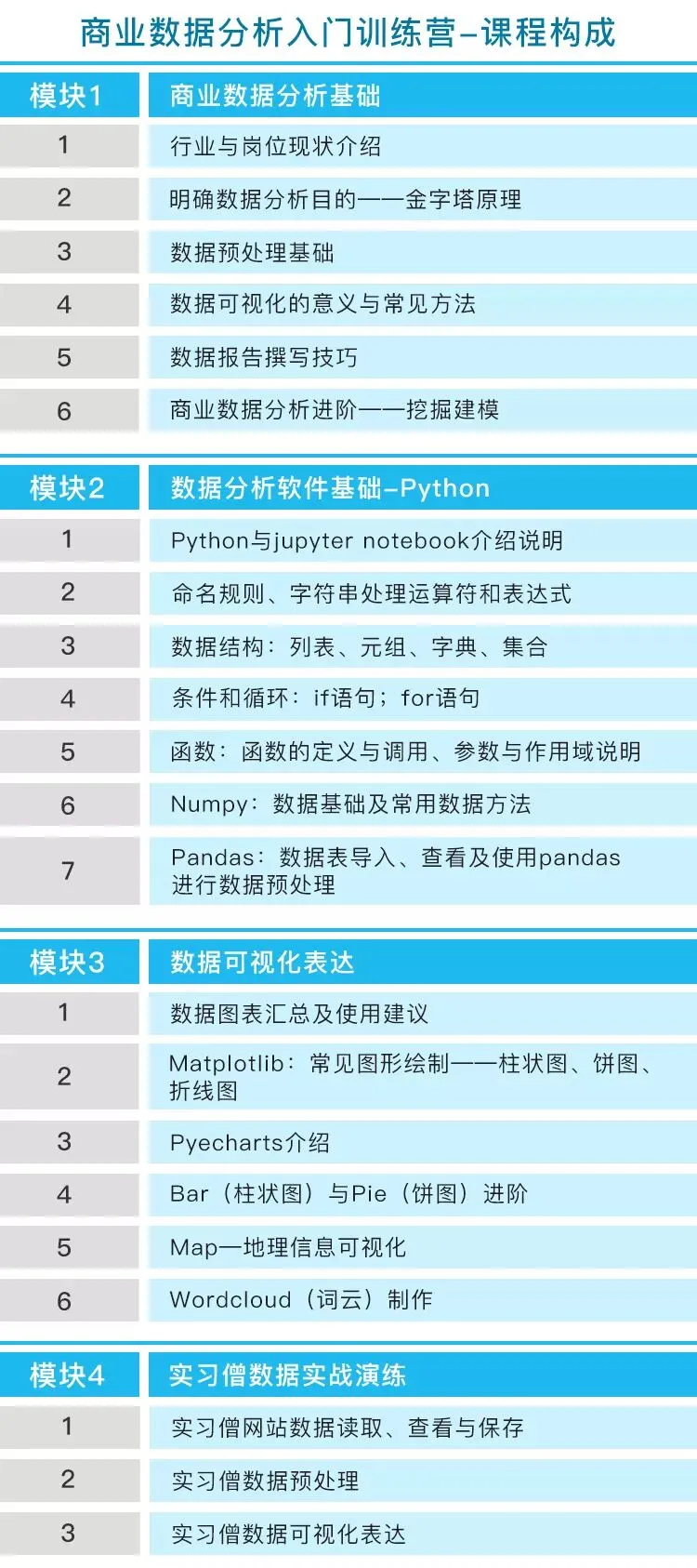 通过7天商业数据分析入门训练营,学员能在最短时间内收获Python基础、Pyecharts可视化等商业分析前沿技能,从此不再害怕数据分析和做图。