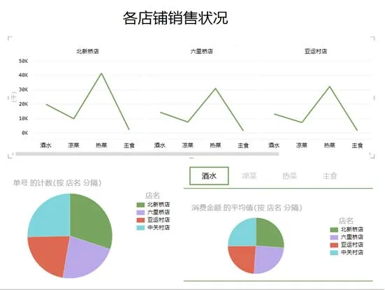 Power View则帮助我们快速简单地制作仪表盘,功能上类似于Excel中的数据透视图表与切片器的组合工具,可以对数据进行快速筛选查看,还可以用它制作出功能丰富的动态图表。(下图为餐饮业分析仪展示)