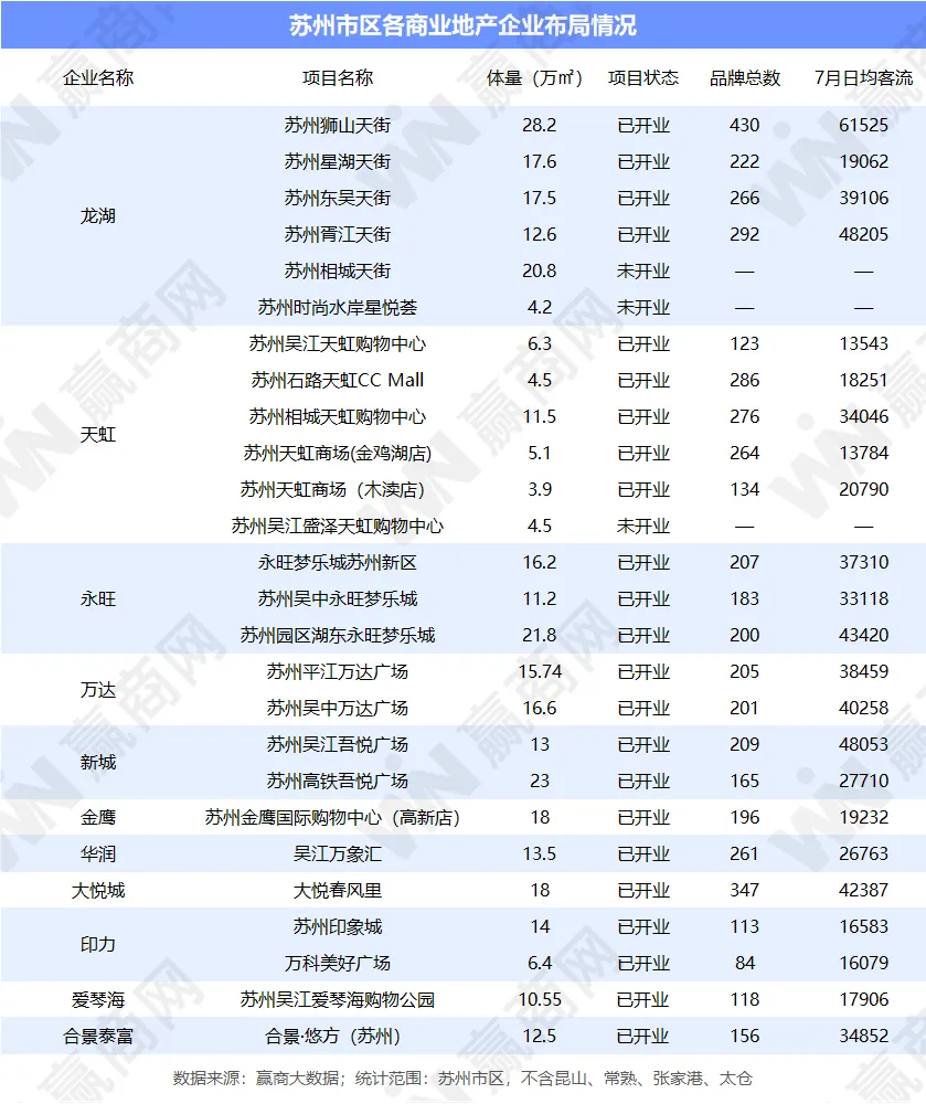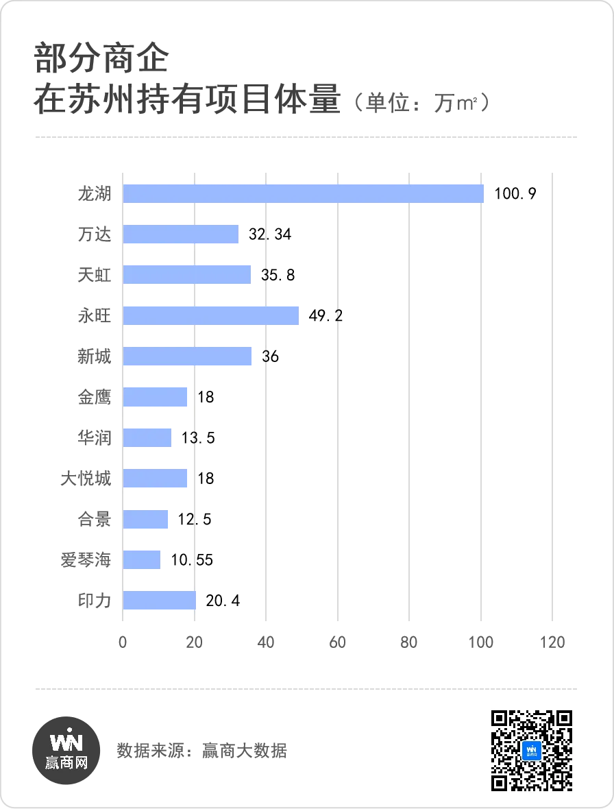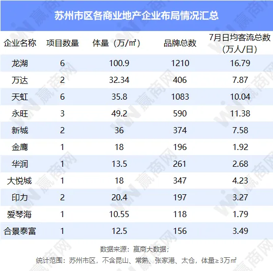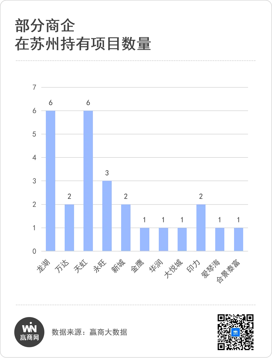 从各企业持有项目数量上来看,龙湖与天虹分别布局了6个项目,并列第一;永旺以3个项目位列第三,万达和新城在苏州市区均有两个项目;华润、大悦城、金鹰分别有1个项目。