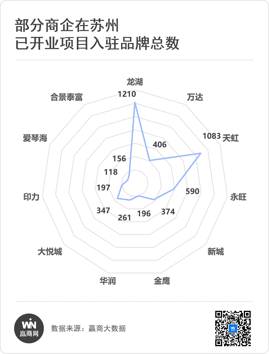综上,龙湖、天虹、永旺三家在苏州市区所持有的项目数量、体量、入驻品牌数以及客流量这四个维度遥遥领先,以深耕苏州的姿态,从众多商业地产企业中脱颖而出。其中,龙湖商业更是以全领域TOP1的综合表现,成为苏州商业当之无愧的“领跑者”。
