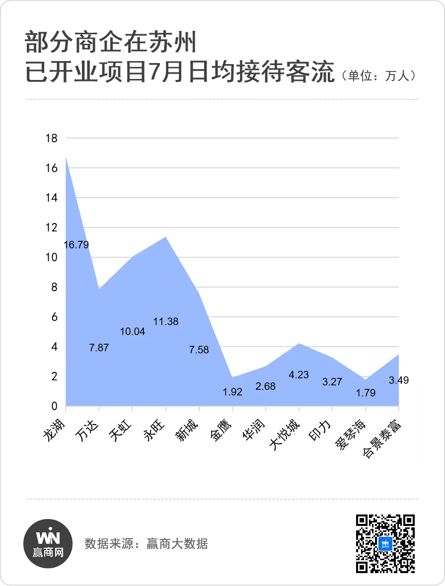 客流表现方面,以赢商大数据上的7月日均去重客流为例,客流量TOP3分别是龙湖、永旺和天虹,7月日均接待消费者分别为16.79万人、11.38万人和10.04万人。