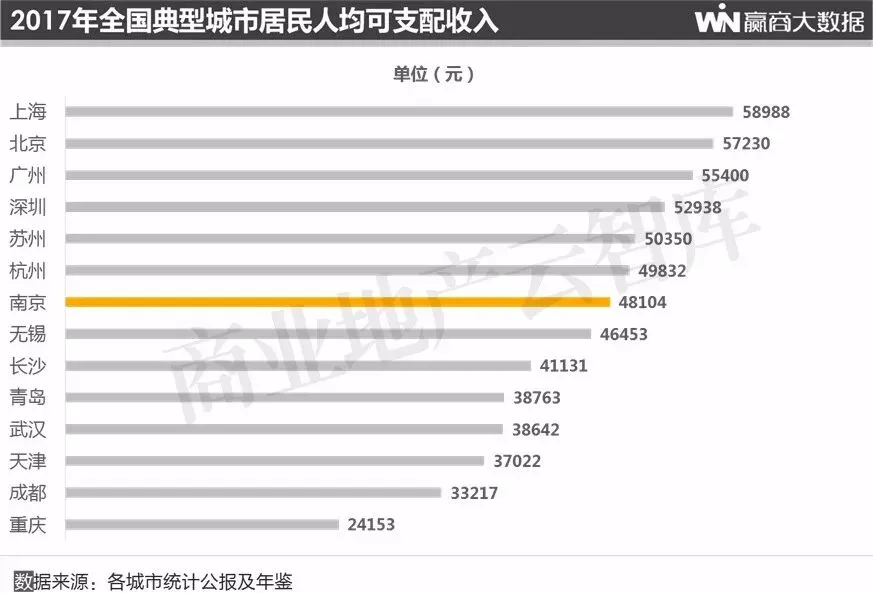 2017年,南京全市居民人均可支配收入48104元,在全国GDP万亿俱乐部城市中居第7位,在全国城市中居于上游水平。
