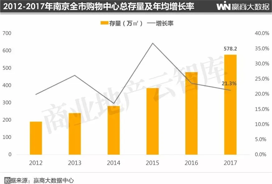 据赢商大数据中心监测,2012-2017年南京购物中心存量年均增长率近25%;截至2018年9月,南京购物中心总存量达708万㎡,发展势头强劲。