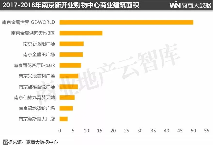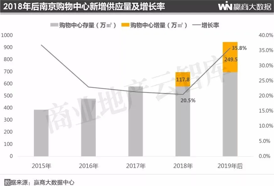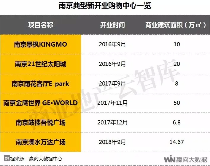 据赢商大数据中心对南京未来拟开业购物中心的监测,由于部分项目延迟入市,2018年新增购物中心约13家,总建筑面积约117.8万㎡,增长率同比放缓至20.5%;2019年以后新增购物中心面积达249.5万㎡,未来2-3年南京新增商业项目供应量达367万㎡,对存量商业有一定冲击。