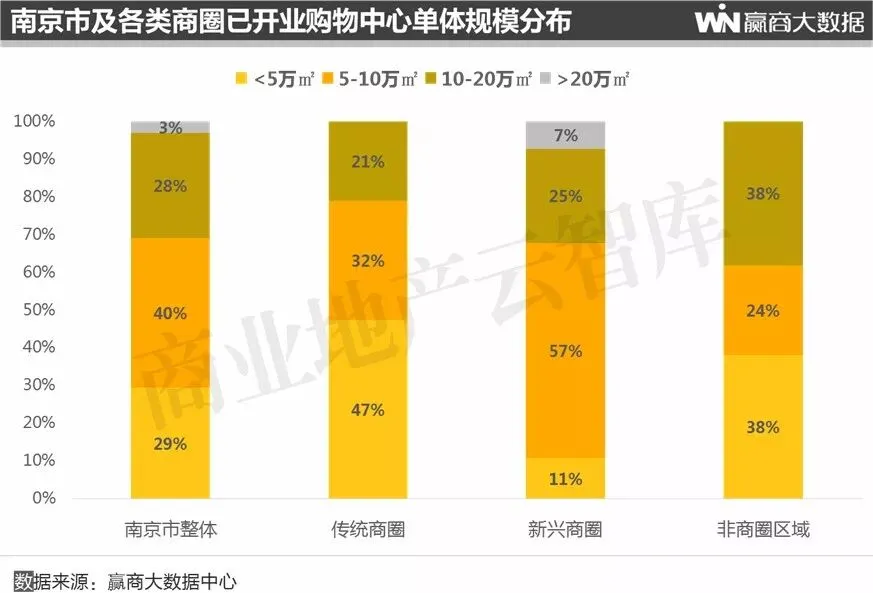 据赢商大数据中心对南京市所有已开业购物中心统计,5-10万㎡购物中心占比较高,达40%。在新兴商圈中,5-10万㎡购物中心占57%;非商圈区域购物中心相对进取,10万㎡以上购物中心占38%,高于商圈区域。