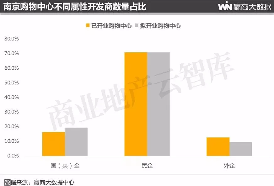 据赢商大数据中心监测,目前南京购物中心以民企开发商为主,整体占比68%,最为活跃。